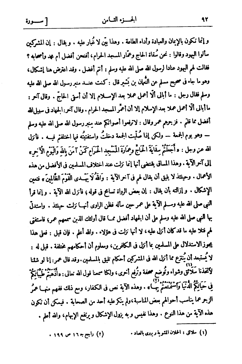وَإِنَّمَا تَكُونُ بِالْإِيمَانِ وَالْعِبَادَةِ وَأَدَاءِ الطَّاعَةِ. وَهَذَا بَيِّنٌ لَا غُبَارَ عَلَيْهِ. وَيُقَالُ: إِنَّ الْمُشْرِكِينَ سَأَلُوا الْيَهُودَ وَقَالُوا: نَحْنُ سُقَاةُ الْحَاجِّ وَعُمَّارُ الْمَسْجِدِ الْحَرَامِ، أَفَنَحْنُ أَفْضَلُ أَمْ مُحَمَّدٌ وَأَصْحَابُهُ؟ فَقَالَتْ لَهُمُ الْيَهُودُ عِنَادًا لِرَسُولِ اللَّهِ صَلَّى اللَّهُ عَلَيْهِ وَسَلَّمَ: أَنْتُمْ أَفْضَلُ. وَقَدِ اعْتَرَضَ هُنَا إِشْكَالٌ وَهُوَ مَا جَاءَ فِي صَحِيحِ مُسْلِمٍ عَنِ النُّعْمَانِ بْنِ بَشِيرٍ قَالَ: كُنْتُ عِنْدَ مِنْبَرِ رَسُولِ اللَّهِ صَلَّى اللَّهُ عَلَيْهِ وَسَلَّمَ فَقَالَ رَجُلٌ: مَا أُبَالِي أَلَّا أَعْمَلَ عَمَلًا بَعْدَ الْإِسْلَامِ إِلَّا أَنْ أَسْقِيَ الْحَاجَّ. وَقَالَ آخَرُ: مَا أُبَالِي أَلَّا أَعْمَلَ عَمَلًا بَعْدَ الْإِسْلَامِ إِلَّا أَنْ أَعْمُرَ الْمَسْجِدَ الْحَرَامَ. وَقَالَ آخَرُ: الْجِهَادُ فِي سَبِيلِ اللَّهِ أَفْضَلُ مما قلتم. فزجر هم عُمَرُ وَقَالَ: لَا تَرْفَعُوا أَصْوَاتَكُمْ عِنْدَ مِنْبَرِ رَسُولِ اللَّهِ صَلَّى اللَّهُ عَلَيْهِ وَسَلَّمَ- وهو يَوْمُ الْجُمُعَةِ- وَلَكِنْ إِذَا صُلِّيَتِ الْجُمُعَةُ دَخَلْتُ وَاسْتَفْتَيْتُهُ فِيمَا اخْتَلَفْتُمْ فِيهِ. فَأَنْزَلَ اللَّهُ عَزَّ وَجَلَّ:" أَجَعَلْتُمْ سِقايَةَ الْحاجِّ وَعِمارَةَ الْمَسْجِدِ الْحَرامِ كَمَنْ آمَنَ بِاللَّهِ وَالْيَوْمِ الْآخِرِ" إِلَى آخِرِ الْآيَةِ. وَهَذَا الْمَسَاقُ يَقْتَضِي أَنَّهَا إِنَّمَا نَزَلَتْ عِنْدَ اخْتِلَافِ الْمُسْلِمِينَ فِي الْأَفْضَلِ مِنْ هَذِهِ الْأَعْمَالِ. وَحِينَئِذٍ لَا يَلِيقُ أَنْ يُقَالَ لَهُمْ فِي آخِرِ الْآيَةِ:" وَاللَّهُ لَا يَهْدِي الْقَوْمَ الظَّالِمِينَ" فَتَعَيَّنَ الْإِشْكَالُ. وَإِزَالَتُهُ بِأَنْ يُقَالَ: إِنَّ بَعْضَ الرُّوَاةِ تَسَامَحَ فِي قَوْلِهِ، فَأَنْزَلَ اللَّهُ الْآيَةَ. وَإِنَّمَا قَرَأَ النَّبِيُّ صَلَّى اللَّهُ عَلَيْهِ وَسَلَّمَ الْآيَةَ عَلَى عُمَرَ حِينَ سَأَلَهُ فَظَنَّ الرَّاوِي أَنَّهَا نَزَلَتْ حِينَئِذٍ. وَاسْتَدَلَّ بِهَا النَّبِيُّ صَلَّى اللَّهُ عَلَيْهِ وَسَلَّمَ عَلَى أَنَّ الْجِهَادَ أَفْضَلُ مِمَّا قَالَ أُولَئِكَ الَّذِينَ سَمِعَهُمْ عُمَرُ، فَاسْتَفْتَى لَهُمْ فَتَلَا عَلَيْهِ مَا قَدْ كَانَ أُنْزِلَ عَلَيْهِ، لَا أَنَّهَا نَزَلَتْ فِي هَؤُلَاءِ. وَاللَّهُ أَعْلَمُ. فَإِنْ قِيلَ: فَعَلَى هَذَا يَجُوزُ الِاسْتِدْلَالُ عَلَى الْمُسْلِمِينَ بِمَا أُنْزِلَ فِي الْكَافِرِينَ، وَمَعْلُومٌ أَنَّ أَحْكَامَهُمْ مُخْتَلِفَةٌ. قِيلَ لَهُ: لَا يُسْتَبْعَدُ أَنْ يُنْتَزَعَ مِمَّا أَنْزَلَ اللَّهُ فِي الْمُشْرِكِينَ أَحْكَامٌ تَلِيقُ بِالْمُسْلِمِينَ. وَقَدْ قَالَ عُمَرُ: إِنَّا لَوْ شِئْنَا لَاتَّخَذْنَا سَلَائِقَ «١» وَشِوَاءً وَتُوضَعُ صَحْفَةٌ وَتُرْفَعُ أُخْرَى وَلَكِنَّا سَمِعْنَا قَوْلَ اللَّهِ تَعَالَى:" أَذْهَبْتُمْ طَيِّباتِكُمْ فِي حَياتِكُمُ الدُّنْيا وَاسْتَمْتَعْتُمْ بِها" «٢» [الأحقاف: ٢٠]. وَهَذِهِ الْآيَةُ نَصٌّ فِي الْكُفَّارِ، وَمَعَ ذَلِكَ فَفَهِمَ مِنْهَا عُمَرُ الزَّجْرَ عَمَّا يُنَاسِبُ أَحْوَالَهُمْ بَعْضَ الْمُنَاسَبَةِ، وَلَمْ يُنْكِرْ عَلَيْهِ أَحَدٌ مِنَ الصَّحَابَةِ. فَيُمْكِنُ أَنْ تَكُونَ هَذِهِ الْآيَةُ مِنْ هَذَا النَّوْعِ. وَهَذَا نَفِيسٌ وَبِهِ يَزُولُ الْإِشْكَالُ ويرتفع الإبهام، والله أعلم.