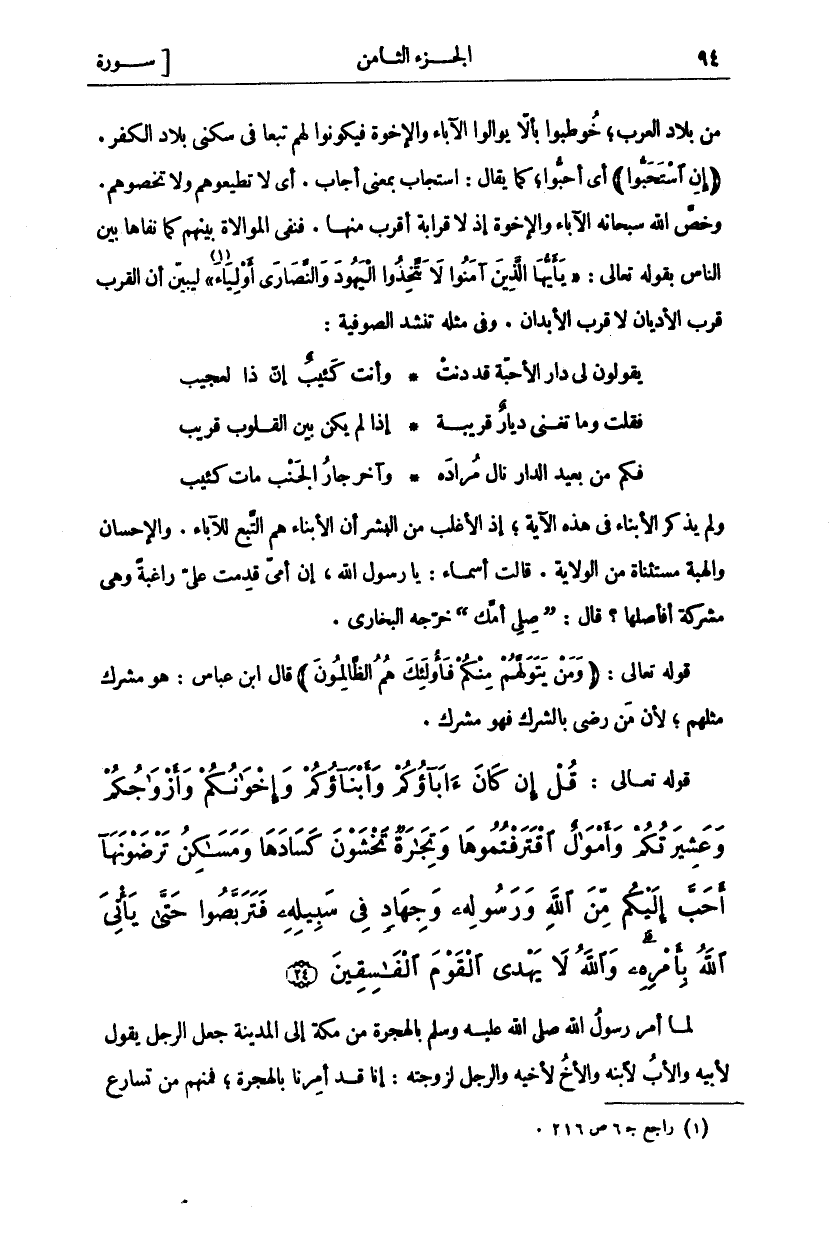 مِنْ بِلَادِ الْعَرَبِ، خُوطِبُوا بِأَلَّا يُوَالُوا الْآبَاءَ وَالْإِخْوَةَ فَيَكُونُوا لَهُمْ تَبَعًا فِي سُكْنَى بِلَادِ الْكُفْرِ." إِنِ اسْتَحَبُّوا" أَيْ أَحَبُّوا، كَمَا يُقَالُ: اسْتَجَابَ بِمَعْنَى أَجَابَ. أَيْ لَا تُطِيعُوهُمْ وَلَا تَخُصُّوهُمْ. وَخَصَّ اللَّهُ سُبْحَانَهُ الْآبَاءَ وَالْإِخْوَةَ إِذْ لَا قَرَابَةَ أَقْرَبُ مِنْهَا. فَنَفَى الْمُوَالَاةَ بَيْنَهُمْ كَمَا نَفَاهَا بَيْنَ النَّاسِ بِقَوْلِهِ تَعَالَى:" يَا أَيُّهَا الَّذِينَ آمَنُوا لَا تَتَّخِذُوا الْيَهُودَ وَالنَّصارى أَوْلِياءَ" «١» [المائدة: ٥١] لِيُبَيِّنَ أَنَّ الْقُرْبَ قُرْبُ الْأَدْيَانِ لَا قُرْبُ الْأَبْدَانِ. وَفِي مِثْلِهِ تُنْشِدُ الصُّوفِيَّةُ:
