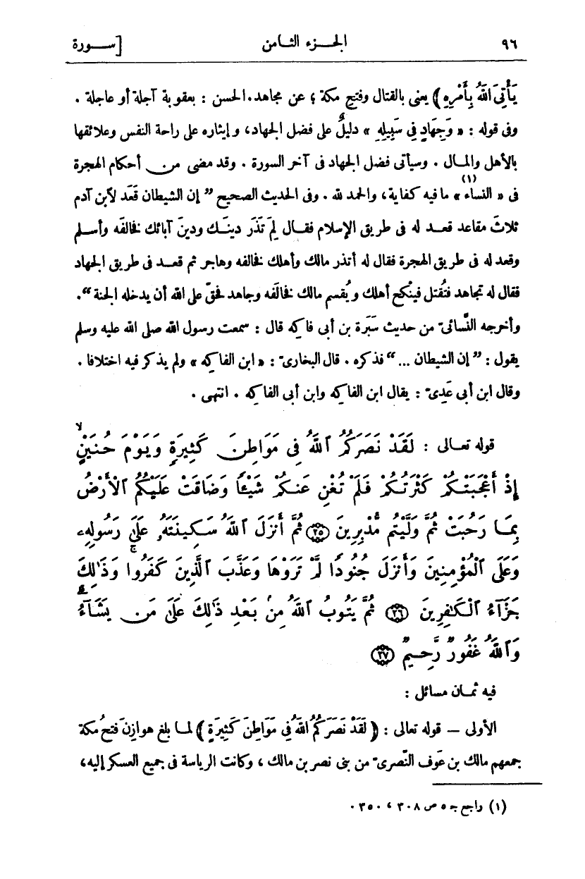 لَقَدْ نَصَرَكُمُ اللَّهُ فِي مَواطِنَ كَثِيرَةٍ وَيَوْمَ حُنَيْنٍ إِذْ أَعْجَبَتْكُمْ كَثْرَتُكُمْ فَلَمْ تُغْنِ عَنْكُمْ شَيْئاً وَضاقَتْ عَلَيْكُمُ الْأَرْضُ بِما رَحُبَتْ ثُمَّ وَلَّيْتُمْ مُدْبِرِينَ (٢٥) ثُمَّ أَنْزَلَ اللَّهُ سَكِينَتَهُ عَلى رَسُولِهِ وَعَلَى الْمُؤْمِنِينَ وَأَنْزَلَ جُنُوداً لَمْ تَرَوْها وَعَذَّبَ الَّذِينَ كَفَرُوا وَذلِكَ جَزاءُ الْكافِرِينَ (٢٦) ثُمَّ يَتُوبُ اللَّهُ مِنْ بَعْدِ ذلِكَ عَلى مَنْ يَشاءُ وَاللَّهُ غَفُورٌ رَحِيمٌ (٢٧)
