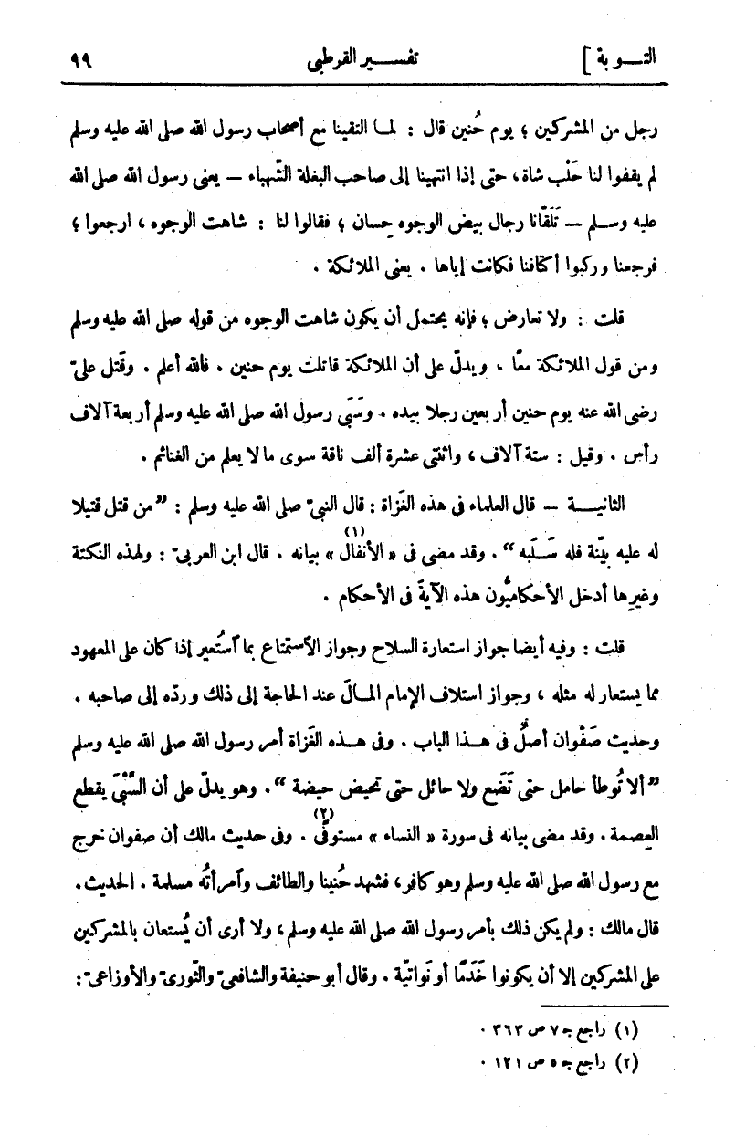 رَجُلٌ مِنَ الْمُشْرِكِينَ، يَوْمَ حُنَيْنٍ قَالَ: لَمَّا الْتَقَيْنَا مَعَ أَصْحَابِ رَسُولِ اللَّهِ صَلَّى اللَّهُ عَلَيْهِ وَسَلَّمَ لَمْ يَقِفُوا لَنَا حَلْبَ شَاةٍ، حَتَّى إِذَا انْتَهَيْنَا إِلَى صَاحِبِ الْبَغْلَةِ الشَّهْبَاءِ- يَعْنِي رَسُولَ اللَّهِ صَلَّى اللَّهُ عَلَيْهِ وَسَلَّمَ- تَلَقَّانَا رِجَالٌ بِيضُ الْوُجُوهِ حِسَانٌ، فَقَالُوا لَنَا: شَاهَتِ الْوُجُوهُ، ارْجِعُوا، فَرَجَعْنَا وَرَكِبُوا أَكْتَافَنَا فَكَانَتْ إِيَّاهَا. يَعْنِي الْمَلَائِكَةَ. قُلْتُ: وَلَا تَعَارُضَ فَإِنَّهُ يَحْتَمِلُ أَنْ يَكُونَ شَاهَتِ الْوُجُوهُ مِنْ قَوْلِهِ صَلَّى اللَّهُ عَلَيْهِ وَسَلَّمَ وَمِنْ قَوْلِ الْمَلَائِكَةِ مَعًا وَيَدُلُّ عَلَى أَنَّ الْمَلَائِكَةَ قَاتَلَتْ يَوْمَ حُنَيْنٍ. فَاللَّهُ أَعْلَمُ. وَقَتَلَ عَلِيٌّ رَضِيَ اللَّهُ عَنْهُ يَوْمَ حُنَيْنٍ أَرْبَعِينَ رَجُلًا بِيَدِهِ. وَسَبَى رَسُولُ اللَّهِ صَلَّى اللَّهُ عَلَيْهِ وَسَلَّمَ أَرْبَعَةٌ آلَافِ رَأْسٍ. وَقِيلَ: سِتَّةَ آلَافٍ، وَاثْنَتَيْ عَشْرَةَ أَلْفِ نَاقَةٍ سِوَى مَا لَا يُعْلَمُ مِنَ الْغَنَائِمِ. الثَّانِيَةُ- قَالَ الْعُلَمَاءُ فِي هَذِهِ الْغَزَاةِ: قَالَ النَّبِيُّ صَلَّى اللَّهُ عَلَيْهِ وَسَلَّمَ: (مَنْ قَتَلَ قَتِيلًا لَهُ عَلَيْهِ بَيِّنَةٌ فَلَهُ سَلَبُهُ). وَقَدْ مَضَى فِي" الْأَنْفَالِ" «١» بَيَانُهُ. قَالَ ابْنُ الْعَرَبِيِّ: وَلِهَذِهِ النُّكْتَةِ وَغَيْرِهَا أَدْخَلَ الْأَحْكَامِيُّونَ هَذِهِ الْآيَةَ فِي الْأَحْكَامِ. قُلْتُ: وَفِيهِ أَيْضًا جَوَازُ اسْتِعَارَةِ السِّلَاحِ وَجَوَازُ الِاسْتِمْتَاعِ بِمَا اسْتُعِيرَ إِذَا كَانَ عَلَى الْمَعْهُودِ مِمَّا يُسْتَعَارُ لَهُ مِثْلُهُ، وَجَوَازُ اسْتِلَافِ الْإِمَامِ الْمَالَ عِنْدَ الْحَاجَةِ إِلَى ذَلِكَ وَرَدِّهِ إِلَى صَاحِبِهِ. وَحَدِيثُ صَفْوَانَ أَصْلٌ فِي هَذَا الْبَابِ. وَفِي هَذِهِ الْغَزَاةِ أَمَرَ رَسُولُ اللَّهِ صَلَّى اللَّهُ عَلَيْهِ وَسَلَّمَ (إلا تُوطَأُ حَامِلٌ حَتَّى تَضَعَ وَلَا حَائِلٌ حَتَّى تَحِيضَ حَيْضَةً). وَهُوَ يَدُلُّ عَلَى أَنَّ السَّبْيَ يَقْطَعُ الْعِصْمَةَ. وَقَدْ مَضَى بَيَانُهُ فِي سُورَةِ" النِّسَاءِ" مُسْتَوْفًى «٢». وَفِي حَدِيثِ مَالِكٍ أَنَّ صَفْوَانَ خَرَجَ مَعَ رَسُولِ اللَّهِ صَلَّى اللَّهُ عَلَيْهِ وَسَلَّمَ وَهُوَ كَافِرٌ، فَشَهِدَ حُنَيْنًا وَالطَّائِفَ وَامْرَأَتُهُ مُسْلِمَةٌ. الْحَدِيثَ. قَالَ مَالِكٌ: وَلَمْ يَكُنْ ذَلِكَ بِأَمْرِ رَسُولِ اللَّهِ صَلَّى اللَّهُ عَلَيْهِ وَسَلَّمَ، وَلَا أَرَى أَنْ يُسْتَعَانَ بِالْمُشْرِكِينَ عَلَى الْمُشْرِكِينَ إِلَّا أَنْ يَكُونُوا خَدَمًا أَوْ نَوَاتِيَّةً. وَقَالَ أبو حنيفة والشافعي والثوري والأوزاعي: