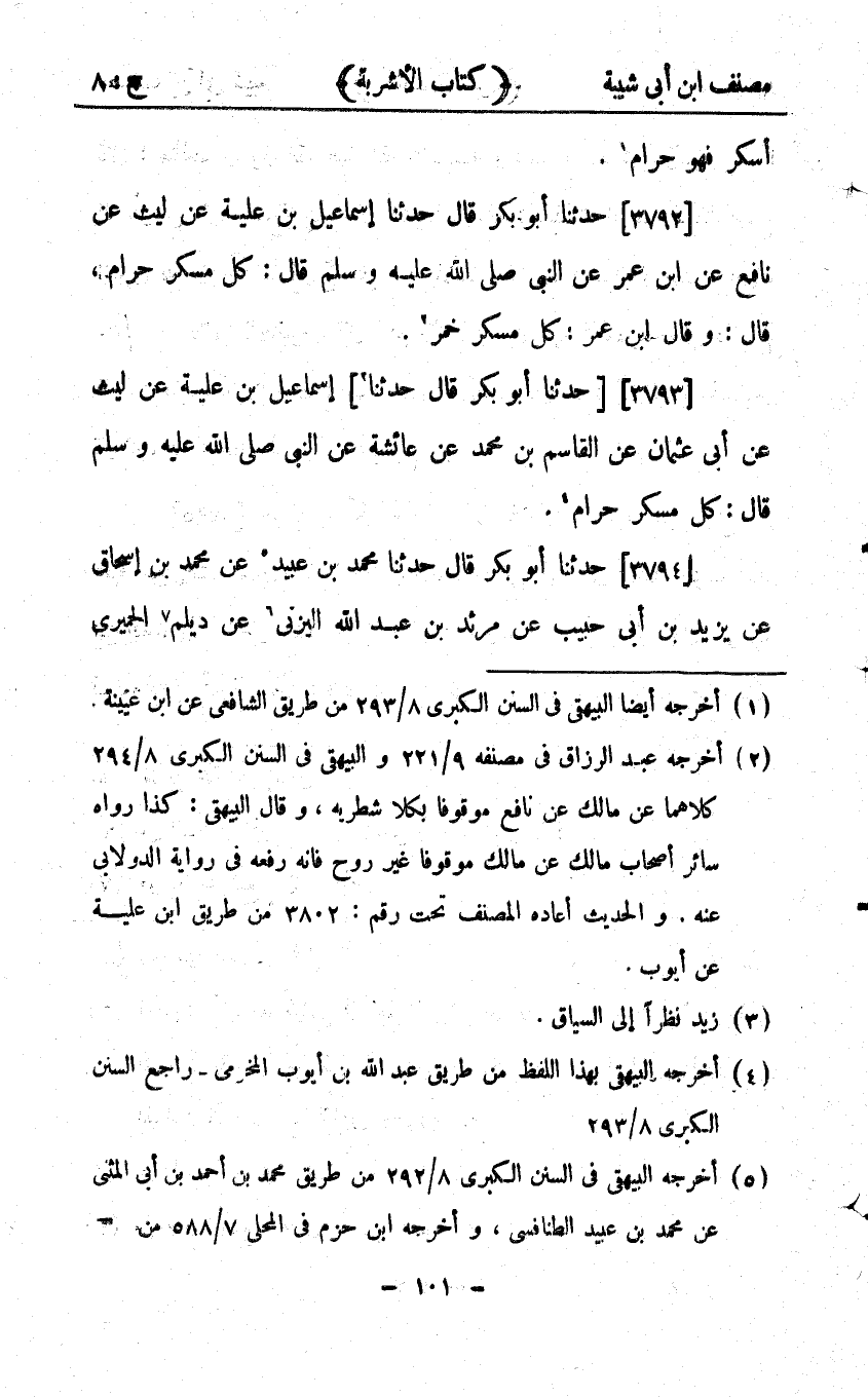 24210- حَدَّثَنَا قَبِيصَةُ ، عَنْ سُفْيَانُ ، عَنْ عَلِيِّ بْنِ بَذِيمَةَ ، عَنْ قيَسْ ِبْنِ حَبْتَرٍ ، عَنِ ابْنِ عَبَّاسٍ ، عن النَّبِيِّ صلى الله عليه وسلم ، قَالَ : كُلُّ مُسْكِرٍ حَرَامٌ.