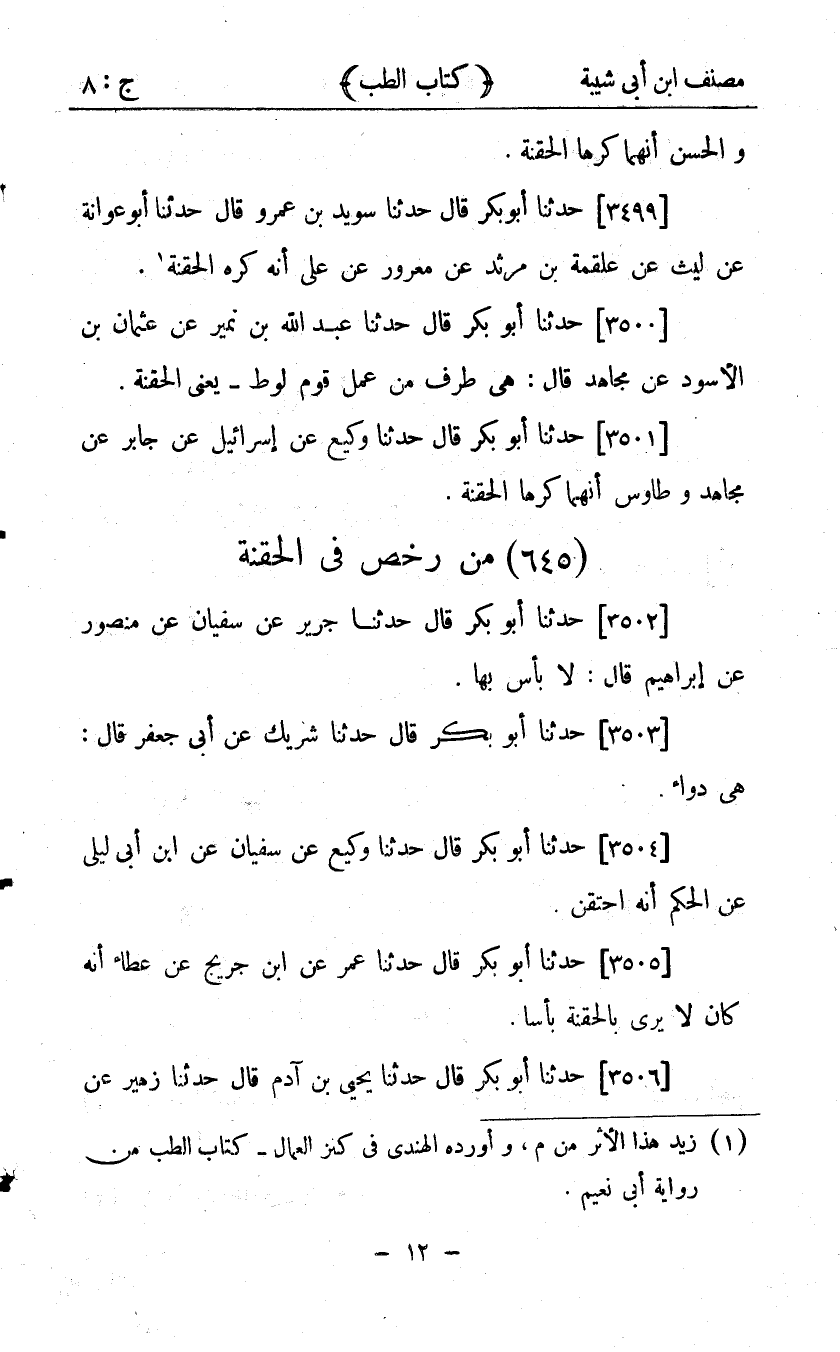 23921 - حَدَّثَنَا يَحْيَى بْنُ آدَمَ، قَالَ: حدَّثَنَا زُهَيْرٌ، عَنْ مُغِيرَةَ، قَالَ: حَدَّثَنِي أَبُو مَعْشَرٍ، عَنْ إِبْرَاهِيمَ؛ أَنَّهُ كَانَ لاَ يَرَى بِالْحُقْنَةِ بَأْسًا.