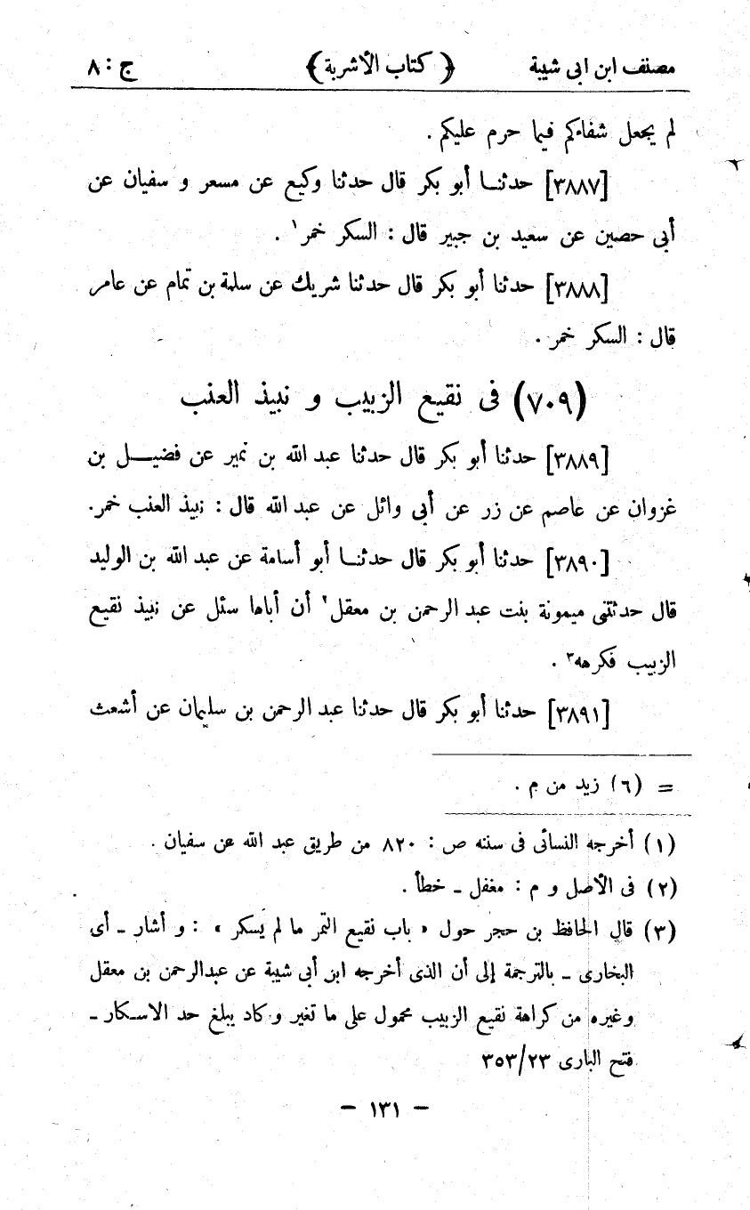 24307- حَدَّثَنَا عَبْدُ اللهِ بْنُ نُمَيْرٍ ، عَنْ فُضَيْلِ بْنِ غَزْوَانَ ، عَنْ عَاصِمٍ ، عَنْ زِرٍّ ، عَنْ أَبِي وَائِلٍ ، عَنْ عَبْدِ اللهِ ، قَالَ : نَبِيذُ الَعِنَبِ خَمْرٌ.