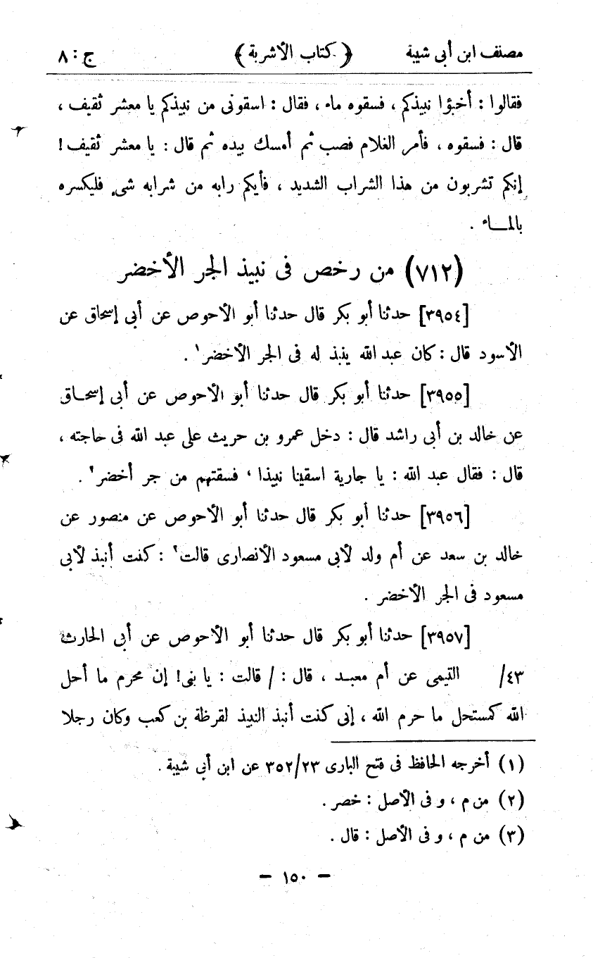 24373- حَدَّثَنَا أَبُو الأَحْوَصِ ، عَنْ أَبِي إِسْحَاقَ ، عَنِ الأَسْوَدِ ، قَالَ : كَانَ عَبْدُ اللهِ يُنْبَذُ لَهُ فِي الْجَرِّ الأَخْضَرِ.