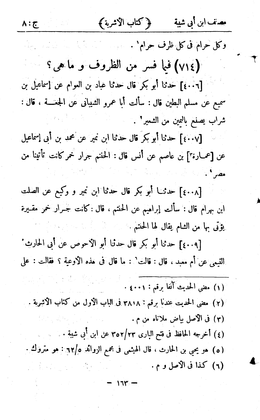 24428 - حَدَّثَنَا أَبُو الأَحْوَصِ، عَنْ أَبِي الْحَارِثِ التَّيْمِيِّ، عَنْ أُمِّ مَعْبَدٍ، قَالَ: قُلْتُ: مَا قَالَ فِي هَذِهِ الأَوْعِيَةِ؟ فَقَالَتْ: عَلَى الْخَبِيرِ سَقَطْتَ، أَمَّا الْحَنَاتِمُ فَحَنَاتِمُ الْعَجَمِ، الَّتِي يَدْخُلُ فِيهَا الرَّجُلُ فَيَكْنِسُهَا كَنْسًا: ظُرُوفُ الْخَمْرِ، وَأَمَّا الدُّبَّاءُ فَالْقَرْعُ، وَأَمَّا الْمُزَفَّتُ فَالزِّقَاقُ الْمُقَيَّرَةُ أَجْوَافُهَا، الْمُلَوَّنَةُ أَشْعَارُهَا بِالْقَارِ: ظُرُوفُ الْخَمْرِ، وَأَمَّا النَّقِيرُ فَالنَّخْلَةُ الثَّابِتَةُ عُرُوقُهَا فِي الأَرْضِ، الْمَنْقُورَةُ نَقْرًا.