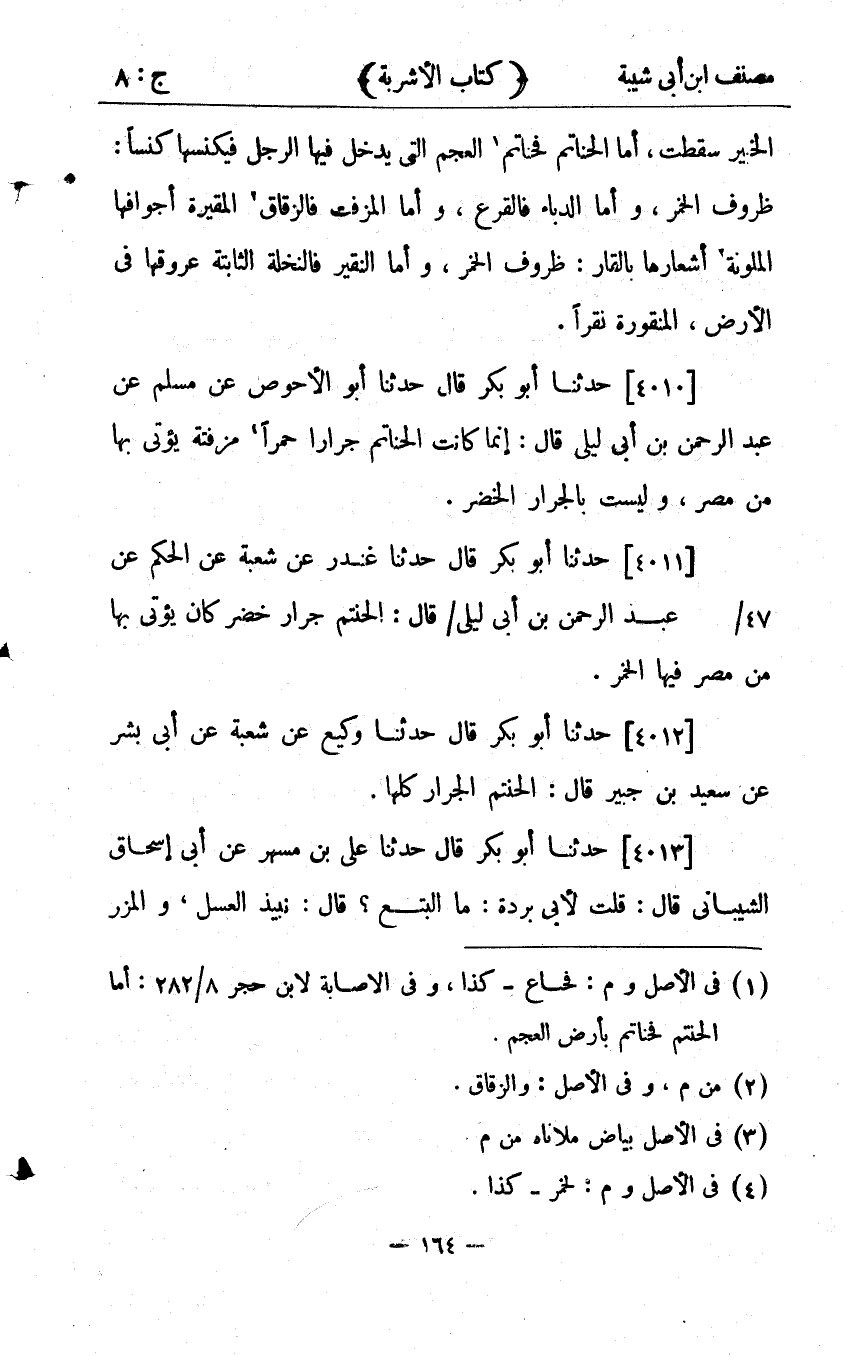 24429- حَدَّثَنَا أَبُو الأَحْوَصِ ، عَنْ مُسْلِمٍ ، عَنْ عَبْدِ الرَّحْمَنِ بْنِ أَبِي لَيْلَى ، قَالَ : إِنَّمَا كَانَتِ الْحَنَاتِمُ جِرَارًا حُمْرًا مُزَفَّتَةً ، يُؤْتَى بِهَا مِنْ مِصْرَ ، وَلَيْسَتْ بِالْجِرَارِ الْخُضْرِ.