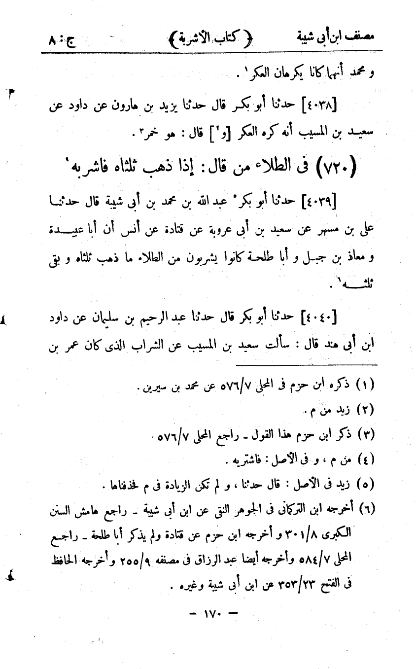 24460- حدَّثَنَا عَلِيُّ بْنُ مُسْهِرٍ ، عَنْ سَعِيدِ بْنِ أَبِي عَرُوبَةَ ، عَنْ قَتَادَةَ ، عَنْ أَنَسٍ ؛ أَنَّ أَبَا عُبَيْدَةَ ، وَمُعَاذَ بْنَ جَبَلٍ ، وَأَبَا طَلْحَةَ كَانُوا يَشْرَبُونَ مِنَ الطِّلاَءِ مَا ذَهَبَ ثُلُثَاهُ وَبَقِيَ ثُلُثُهُ.