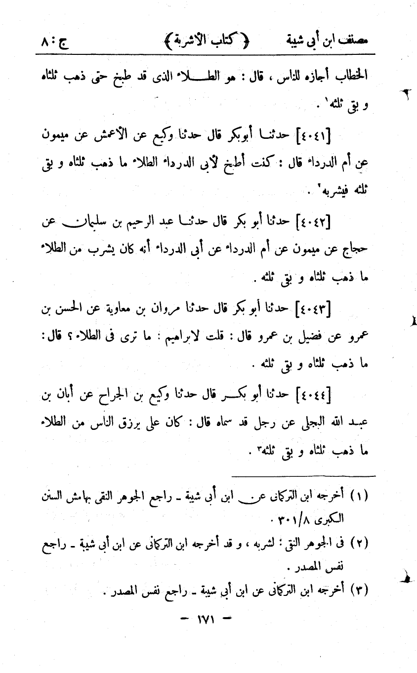 24463- حَدَّثَنَا عَبْدُ الرَّحِيمِ بْنُ سُلَيْمَانَ ، عَنْ حَجَّاجٍ ، عَنْ مَيْمُونٍ ، عَنْ أُمِّ الدَّرْدَاءِ ، عَنْ أَبِي الدَّرْدَاءِ ؛ أَنَّهُ كَانَ يَشْرَبُ مِنَ الطِّلاَءِ مَا ذَهَبَ ثُلُثَاهُ وَبَقِيَ ثُلُثُهُ.