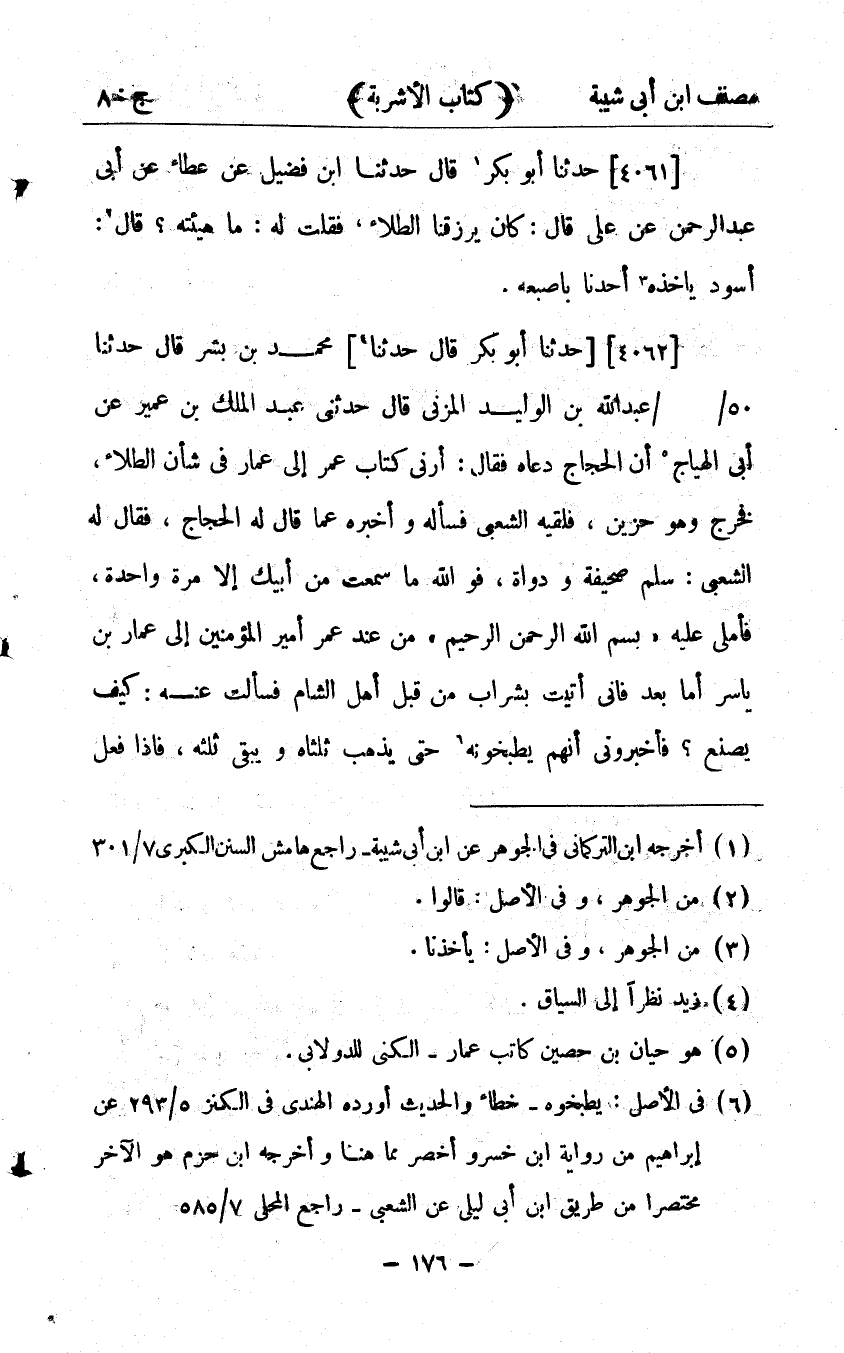 24484- حَدَّثَنَا مُحَمَّدُ بْنُ بِشْرٍ ، قَالَ : حدَّثَنَا عَبْدُ اللهِ بْنُ الْوَلِيدِ الْمُزَنِيُّ ، قَالَ : حَدَّثَنِي عَبْدُ الْمَلِكِ بْنُ عُمَيْرٍ ، عَنْ أَبِي الْهَيَّاجِ ؛ أَنَّ الْحَجَّاجَ دَعَاهُ فَقَالَ : أَرِنِي كِتَابَ عُمَرَ إِلَى عَمَّارٍ فِي شَأْنِ الطِّلاَءِ ، فَخَرَجَ وَهُوَ حَزِينٌ ، فَلَقِيَهُ الشَّعْبِيُّ فَسَأَلَهُ ، فَأَخْبَرَهُ عَمَا قَالَ لَهُ الْحَجَّاجُ ، فَقَالَ لَهُ الشَّعْبِيُّ : هَلمَّ صَحِيفَةً وَدَوَاةً ، فَوَاللَّهِ مَا سَمِعْتُهُ مِنْ أَبِيكَ إِلاَّ مَرَّةً وَاحِدَةً ، فَأَمْلَى عَلَيْهِ : بِسْمِ اللهِ الرَّحْمَنِ الرَّحَيمِ ، مِنْ عَبْدِ اللهِ عُمَرَ أَمِيرِ الْمُؤْمِنِينَ إِلَى عَمَّارِ بْنِ يَاسِرٍ ، أَمَّا بَعْدُ ؛ فَإِنِّي أُتِيتُ بِشَرَابٍ مِنْ قِبَلِ الشَّامِ ، فَسَأَلْتُ عَنْهُ كَيْفَ يُصْنَعُ ؟ فَأَخْبَرُونِي أَنَّهُمْ يَطْبُخُونَهُ حَتَّى يَذْهَبَ ثُلُثَاهُ وَيَبْقَى ثُلُثُهُ ، فَإِذَا فُعِلَ ذَلِكَ بِهِ ذَهَبَ رَسُّهُ وَرِيحُ جُنُونِهِ ، وَذَهَبَ حَرَامُهُ وَبَقِيَ حَلاَلُهُ ، قَالَ عَبْدُ اللهِ : وَأُرَاهُ قَالَ : وَالطَّيِّبُ مِنْهُ ، فَإِذَا أَتَاكَ كِتَابِي هَذَا فَمُرْ مَنْ قِبَلَكَ فَلْيَتَوَسَّعُوا بِهِ فِي أَشْرِبَتِهِمْ ، وَالسَّلاَمُ.