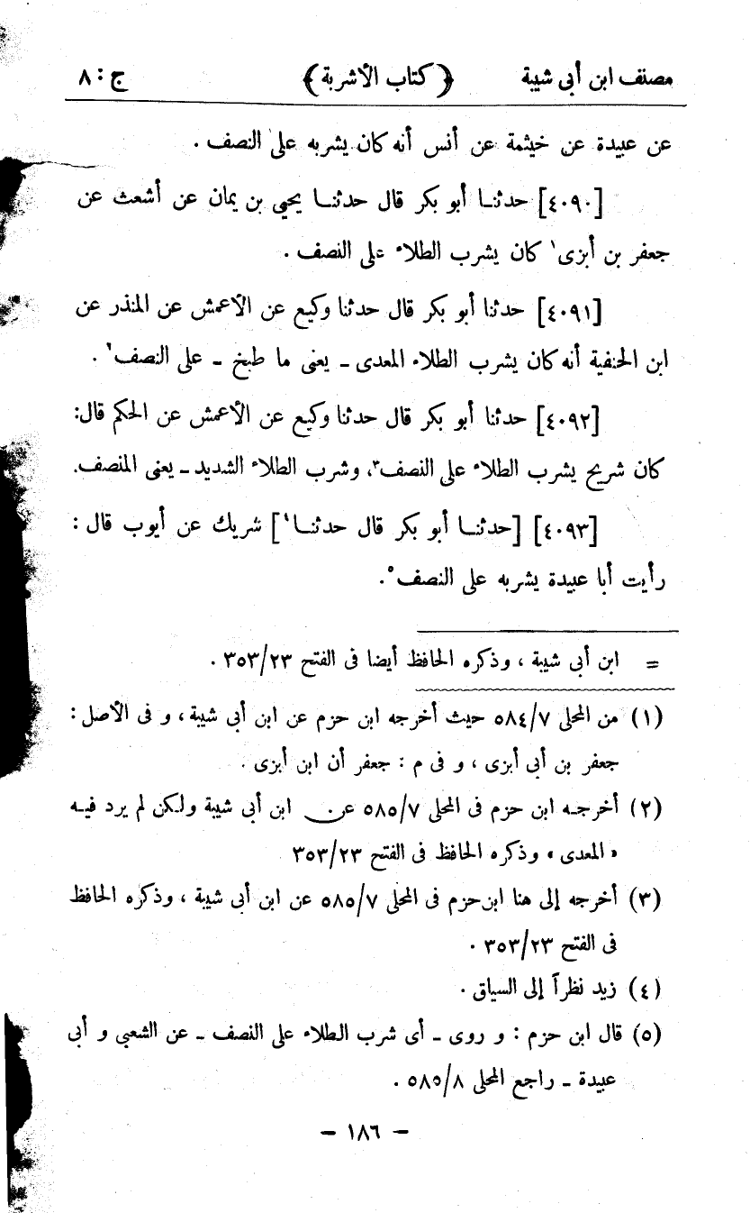 24513- حَدَّثَنَا وَكِيعٌ ، عَنِ الأَعْمَشِ ، عَنِ الْمُنْذِرِ ، عَنِ ابْنِ الْحَنَفِيَّةِ ؛ أَنَّهُ كَانَ يشْرَبُ الطِّلاَءَ الْمقدى ، يَعْنِي مَا طُبِخَ عَلَى النِّصْفِ.