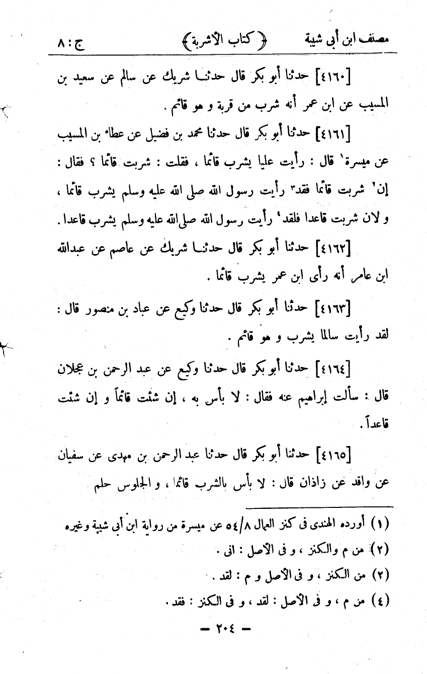 24586 - حَدَّثَنَا شَرِيكٌ، عَنْ عَاصِمٍ، عَنْ عَبْدِ اللهِ بْنِ عَامِرٍ؛ أَنَّهُ رَأَى ابْنَ عُمَرَ يَشْرَبُ قَائِمًا.