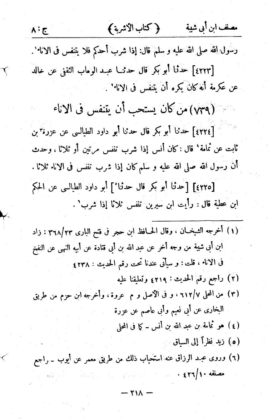 35- مَنْ كَانَ يَستحِبُّ أَنْ يُتَنَفَّسَ فِي الإِنَاءِ.