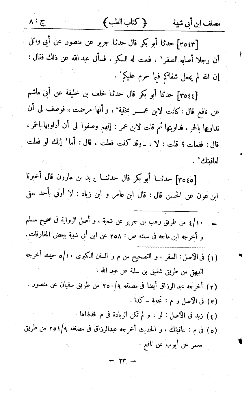 23958- حَدَّثَنَا جَرِيرٌ ، عَنْ مَنْصُورٍ ، عَنْ أَبِي وَائِلٍ ؛ أَنَّ رَجُلاً أَصَابَهُ الصَّفْرُ ، فَنُعِتَ لَهُ السَّكَرُ ، فَسَأَلَ عَبْدَ اللهِ عَنْ ذَلِكَ ؟ فَقَالَ : إِنَّ اللَّهَ لَمْ يَجْعَلْ شِفَاءَكُمْ فِيمَا حَرَّمَ عَلَيْكُمْ.