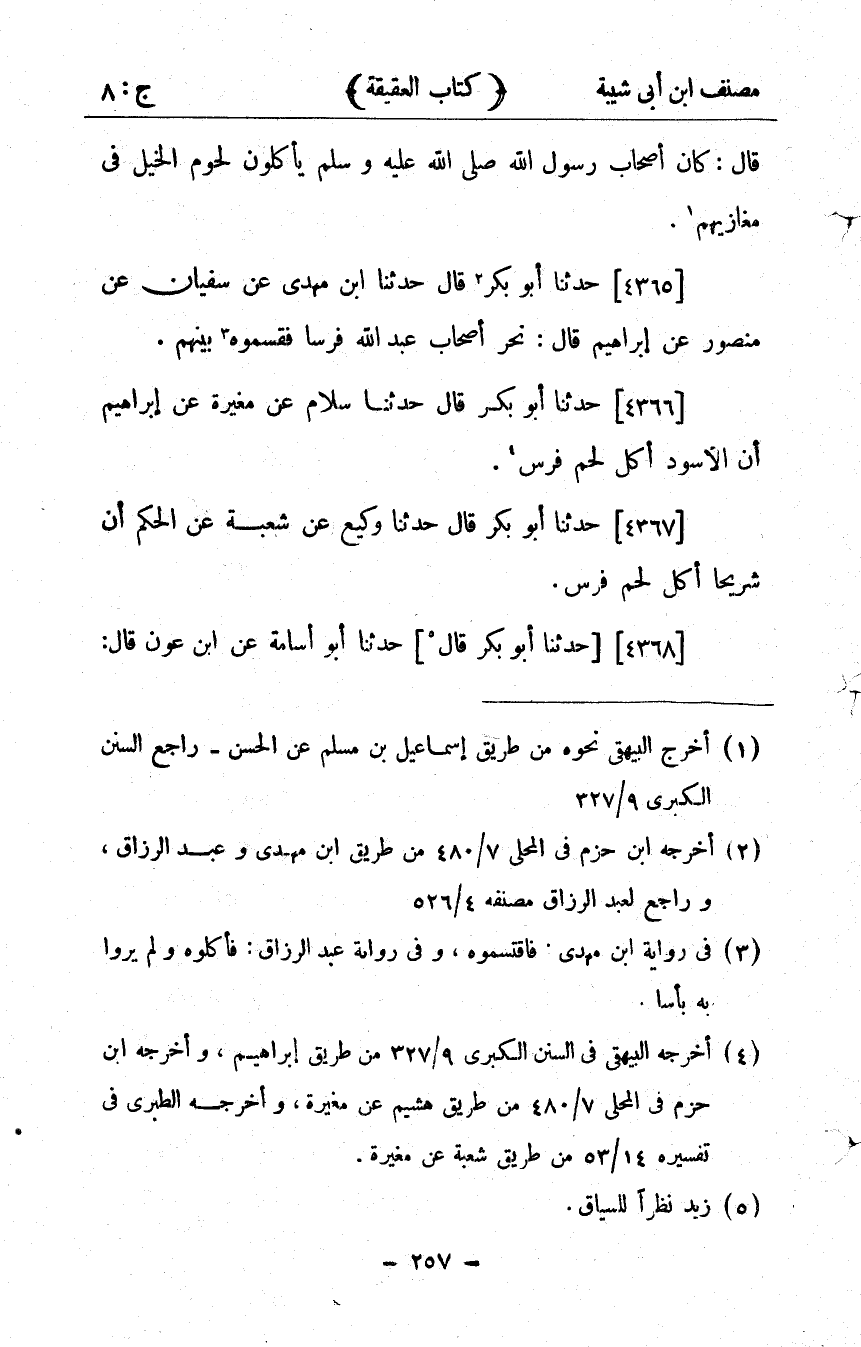 24797- حَدَّثَنَا سَلاَّمٌ ، عَنْ مُغِيرَةَ ، عَنْ إِبْرَاهِيمَ ، قَالَ : كَانَ أَصْحَابُنَا يَأْكُلُونَ لُحُومَ الْخَيْلِ.