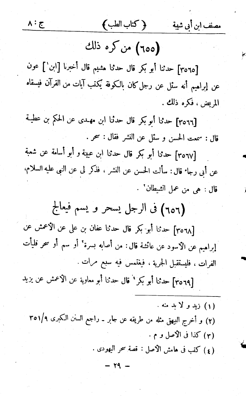 23984- حَدَّثَنَا أَبُو مُعَاوِيَةَ ، عَنِ الأَعْمَشِ ، عَنْ يَزِيدَ بْنِ حَيَّانَ ، عَنْ زَيْدِ بْنِ أَرْقَمَ ، قَالَ : سَحَرَ النَّبِيَّ صلى الله عليه وسلم رَجُلٌ مِنَ الْيَهُودِ ، فَاشْتَكَى النَّبِيُّ صلى الله عليه وسلم لِذَلِكَ أَيَّامًا ، فَأَتَاهُ جِبْرِيلُ فَقَالَ : إِنَّ رَجُلاً كَذَا مِنَ الْيَهُودِ سَحَرَكَ ، عَقَدَ لَكَ عُقَدًا ، فَأَرْسَلَ إِلَيْهَا رَسُولُ اللهِ صلى الله عليه وسلم عَلِيًّا ، فَاسْتَخْرَجَهَا ، فَجَاءَ بِهِ ، فَجَعَلَ كُلَّمَا حَلَّ عُقْدَةً وَجَدَ لِذَلِكَ خِفَّةً ، قَالَ : فَقَامَ النَّبِيُّ صلى الله عليه وسلم كَأَنَّمَا نُشِطَ مِنْ عِقَاْلٍ ، فَمَاْ ذُكِرَ النَّبِيُّ صلى الله عليه وسلم ذَلِكَ الْيَهُودِيَّ ، وَلاَ رَآهُ فِي وَجْهِهِ قَطُّ.