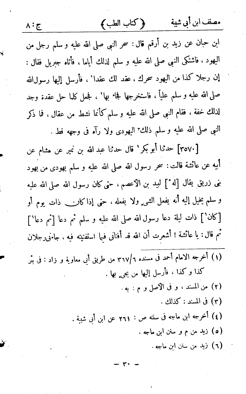 23985- حَدَّثَنَا عَبْدُ اللهِ بْنُ نُمَيْرٍ ، عَنْ هِشَامٍ ، عَنْ أَبِيهِ ، عَنْ عَائِشَةَ ، قَالَتْ : سَحَرَ رَسُولَ اللهِ صلى الله عليه وسلم يَهُودِيٌّ مِنْ يَهُودِ بَنِي زُرَيْقٍ ، يُقَالَ لَهُ : لَبِيدُ بْنُ الأَعْصَمِ ، حَتَّى كَانَ رَسُولُ اللهِ صلى الله عليه وسلم يُخَيَّلُ إِلَيْهِ أَنَّهُ يَفْعَلُ الشَّيْءَ وَلاَ يَفْعَلُهُ ، حَتَّى إِذَا كَانَ ذَاتَ يَوْمٍ ، أَوْ ذَاتَ لَيْلَةٍ ، دَعَا رَسُولُ اللهِ صلى الله عليه وسلم ، ثُمَّ دَعَا ، ثُمَّ قَالَ : يَا عَائِشَةُ ، أَشَعَرْتِ أَنَّ اللَّهَ قَدْ أَفْتَانِي فِيمَا اسْتَفْتيه فِيهِ ؟ جَاءَنِي رَجُلاَنِ ، فَجَلَسَ أَحَدُهُمَا عِنْدَ رَأْسِي ، وَالآخَرُ عِنْدَ رِجْلِي ، فَقَالَ الَّذِي عِنْدَ رَأْسِي لِلَّذِي عِنْدَ رِجْلِي ، أَوِ الَّذِي عِنْدَ رِجْلِي لِلَّذِي عِنْدَ رَأْسِي : مَا وَجَعُ الرَّجُلِ ؟ قَالُوا : مَطْبُوبٌ ، قَالَ : مَنْ طَبَّهُ ؟ قَالَ : لَبِيدُ بْنُ الأَعْصَمِ ، قَالَ : فِي أَيِّ شَيْءٍ ؟ قَالَ : فِي مُشْطٍ وَمُشَاطَةٍ ، وَجُفِّ طَلْعَةِ ذَكَرٍ ، قَالَ : وَأَيْنَ هُوَ ؟ قَالَ : فِي بِئْرِ ذِي أَرْوَانَ ، فَأَتَاهَا رَسُولُ اللهِ صلى الله عليه وسلم فِي أُنَاسٍ مِنْ أَصْحَابِهِ ، ثُمَّ جَاءَ فَقَالَ : يَا عَائِشَةُ ، كَأَنَّمَا مَاؤُهَا نُقَاعَةُ الْحِنَّاءِ ، وَلَكَأَنَّ نَخْلَهَا رُؤُوسُ الشَّيَاطِينِ ، قَالَ : فَقُلْتُ : يَا رَسُولَ اللهِ ، أَفَلاَ أَخْرَجْتَهُ ؟ فَقَالَ : لاَ ، أَمَّا أَنَا فَقَدْ عَافَانِي اللَّهُ ، وَكَرِهْتُ أَنْ أُثِيرَ عَلَى النَّاسِ مِنْهُ شَرًّا ، فَأَمَرَ بِهَا فَدُفِنَتْ.