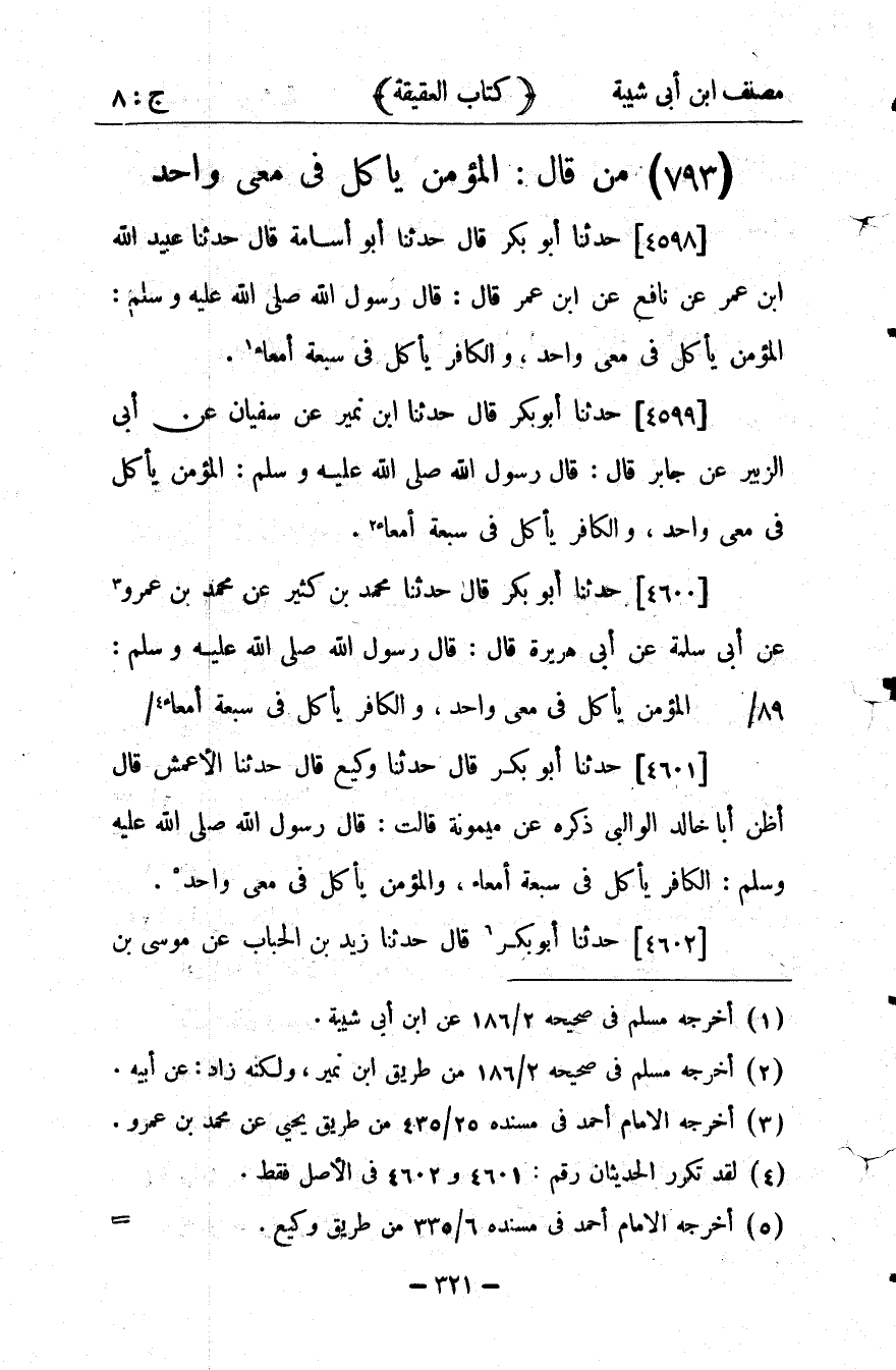 25037- حَدَّثَنَا وَكِيعٌ ، قَالَ : حدَّثَنَا الأَعْمَشُ ، قَالَ : أَظُنُّ أَبَا خَالِدٍ الْوَالِبِيَّ ذَكَرَهُ عَنْ مَيْمُونَةَ ، قَالَتْ : قَالَ رَسُولُ اللهِ صلى الله عليه وسلم : الْكَافِرُ يَأْكُلُ فِي سَبْعَةِ أَمْعَاءٍ ، وَالْمُؤْمِنُ يَأْكُلُ فِي مِعًى وَاحِدٍ.