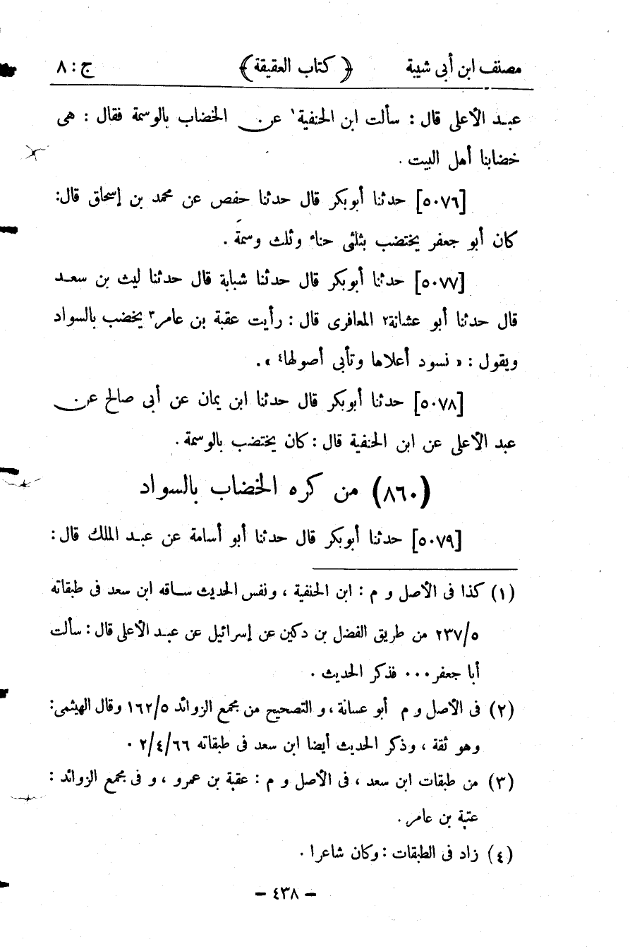 25531- حَدَّثَنَا ابْنُ يَمَانٍ ، عَنْ عَلِيِّ بْنِ صَالِحٍ ، عَنْ عَبْدِ الأَعْلَى ، عَنِ ابْنِ الْحَنَفِيَّةِ ، قَالَ : كَانَ يَخْتَضِبُ بِالْوَسْمَةِ.