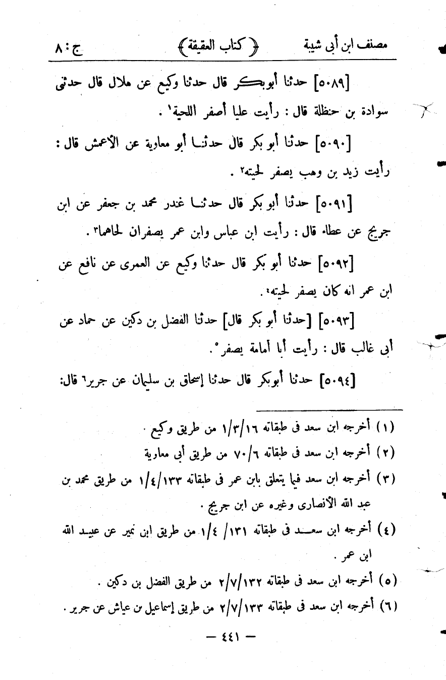 25545- حَدَّثَنَا وَكِيعٌ ، عَنِ الْعُمَرِيِّ ، عَنْ نَافِعٍ ، عَنِ ابْنِ عُمَرَ ، أَنَّهُ كَانَ يُصَفِّرُ لِحْيَتَهُ.