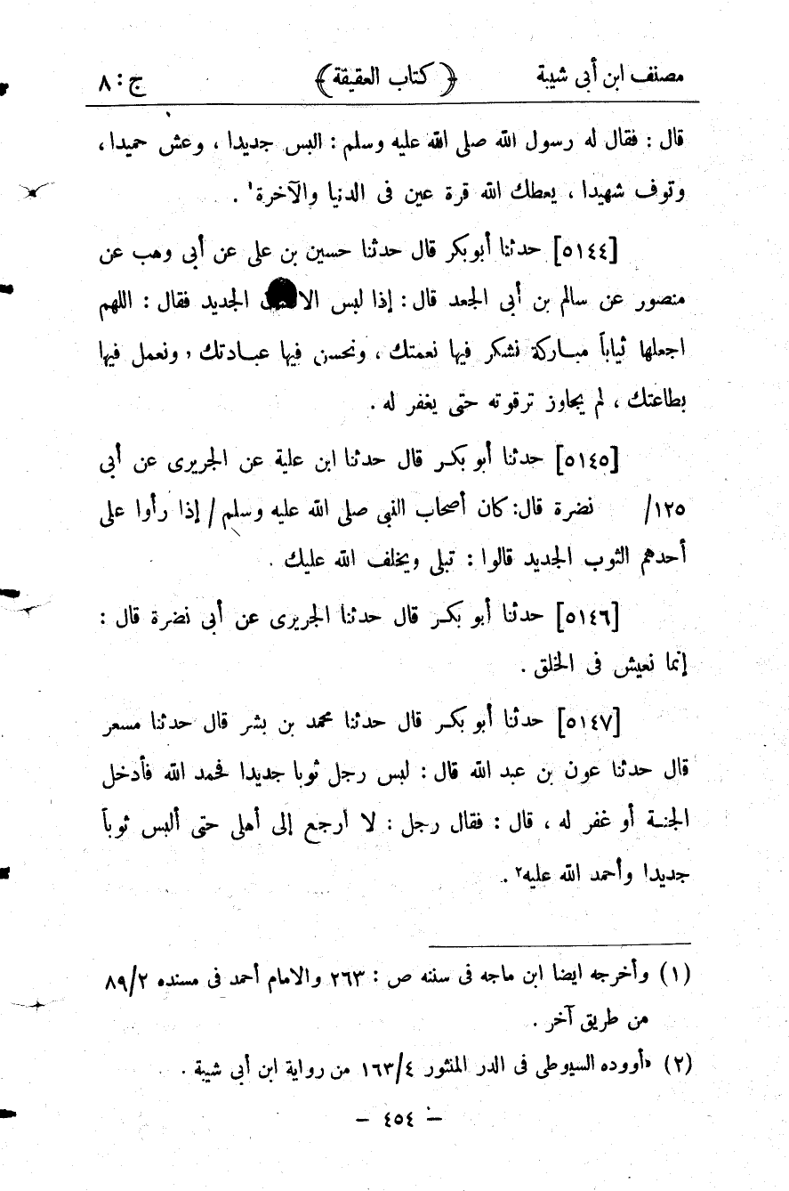 25601- حَدَّثَنَا مُحَمَّدُ بْنُ بِشْرٍ ، قَالَ : حدَّثَنَا مِسْعَرٌ ، قَالَ : حَدَّثَنَا عَوْنُ بْنُ عَبْدِ اللهِ ، قَالَ : لَبِسَ رَجُلٌ ثَوْبًا جَدِيدًا فَحَمِدَ اللَّهَ ، فَأُدْخِلَ الْجَنَّةَ ، أَوْ غُفِرَ لَهُ ، قَالَ : فَقَالَ رَجُلٌ : لاَ أَرْجِعُ إِلَى أَهْلِي حَتَّى أَلْبَسَ ثَوْبًا جَدِيدًا ، وَأَحْمَدَ اللَّهَ عَلَيْهِ.