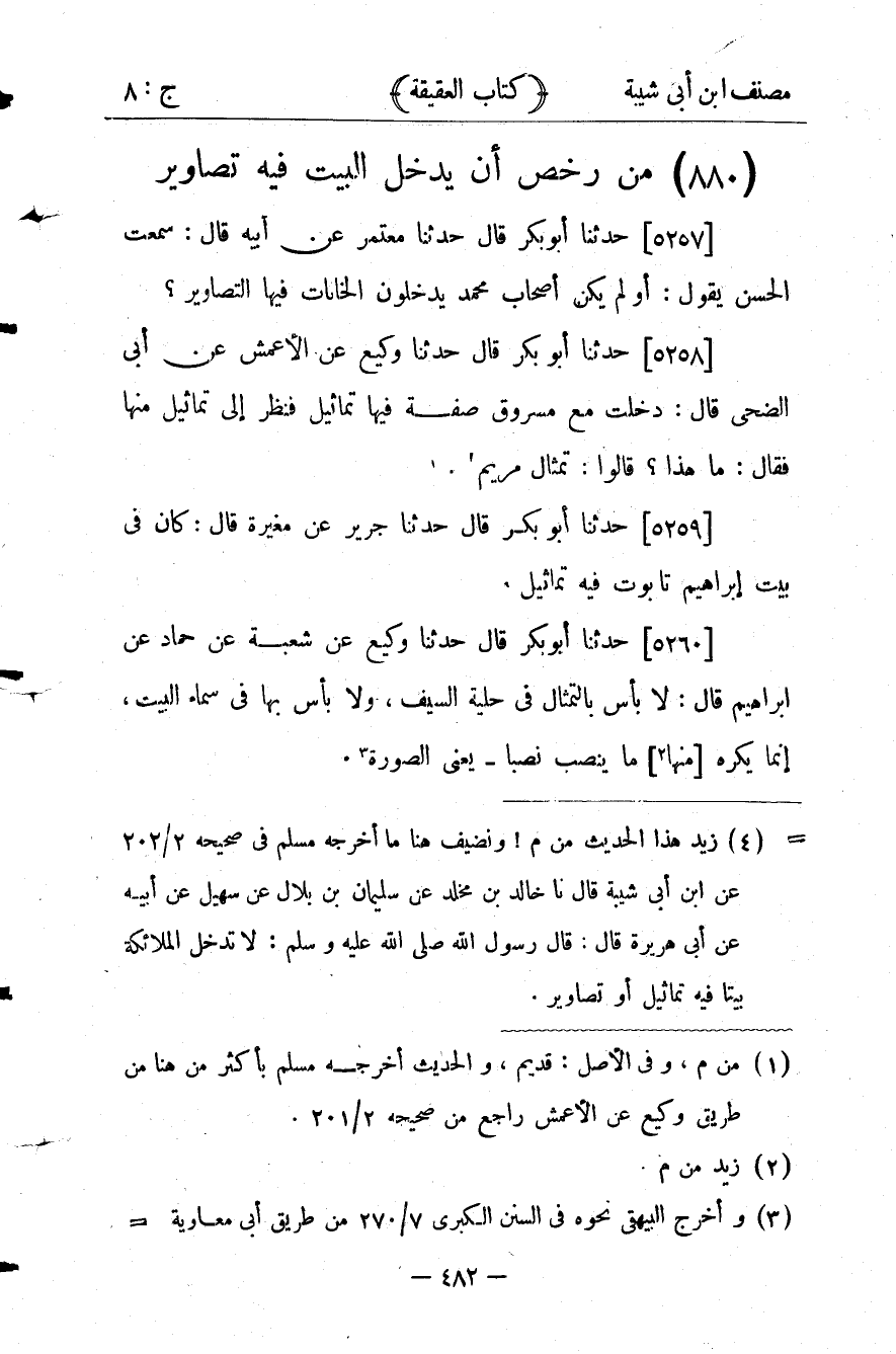25717- حَدَّثَنَا وَكِيعٌ ، عَنْ شُعْبَةَ ، عَنْ حَمَّادٍ ، عَنْ إِبْرَاهِيمَ ، قَالَ : لاَ بَأْسَ بِالتِّمْثَالِ فِي حِلْيَةِ السَّيْفِ ، وَلاَ بَأْسَ بِهَا فِي سَمَاءِ الْبَيْتِ ، إِنَّمَا يُكْرَهُ مِنْهَا مَا نُصب نَصَبًا ، يَعْنِي الصُّورَةَ.