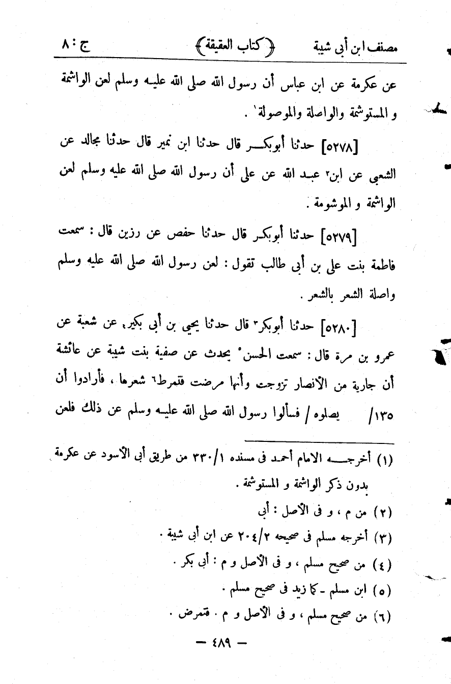 25735- حَدَّثَنَا ابْنُ نُمَيْرٍ ، قَالَ : حدَّثَنَا مُجَالِدٌ ، عَنِ الشَّعْبِيِّ ، عَنْ ابْنِ عَبْدِ اللهِ ، عَنْ عَلِيٍّ ؛ أَنَّ رَسُولَ اللهِ صلى الله عليه وسلم لَعَنَ الْوَاشِمَةَ وَالْمَوْشُومَةَ.