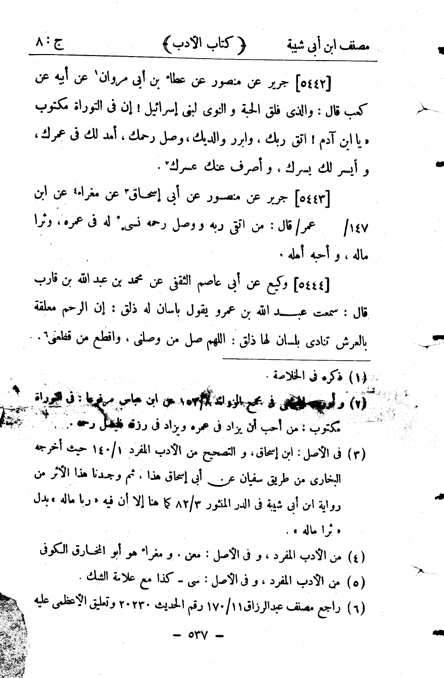 25899- حَدَّثَنَا جَرِيرٌ ، عَنْ مَنْصُورٍ ، عَنْ عَطَاءِ بْنِ أَبِي مَرْوَانَ ، عَنْ أَبِيهِ ، عَنْ كَعْبٍ ، قَالَ : وَالَّذِي فَلَقَ الْبْحَر لِبَنِي إسْرَائِيلَ ، إنَّ فِي التَّوْرَاةِ مَكْتُوبا : ابْنَ آدَمَ ، اتَّقِ رَبَّك ، وَابْرَرْ وَالِدَيْك ، وَصِلْ رَحِمَك ، أَمُدُّ لَكَ فِي عُمْرِكَ ، وَأُيَسِّرُ لَكَ يُسْرَك ، وَأَصْرِفُ عَنْك عُسْرَك.