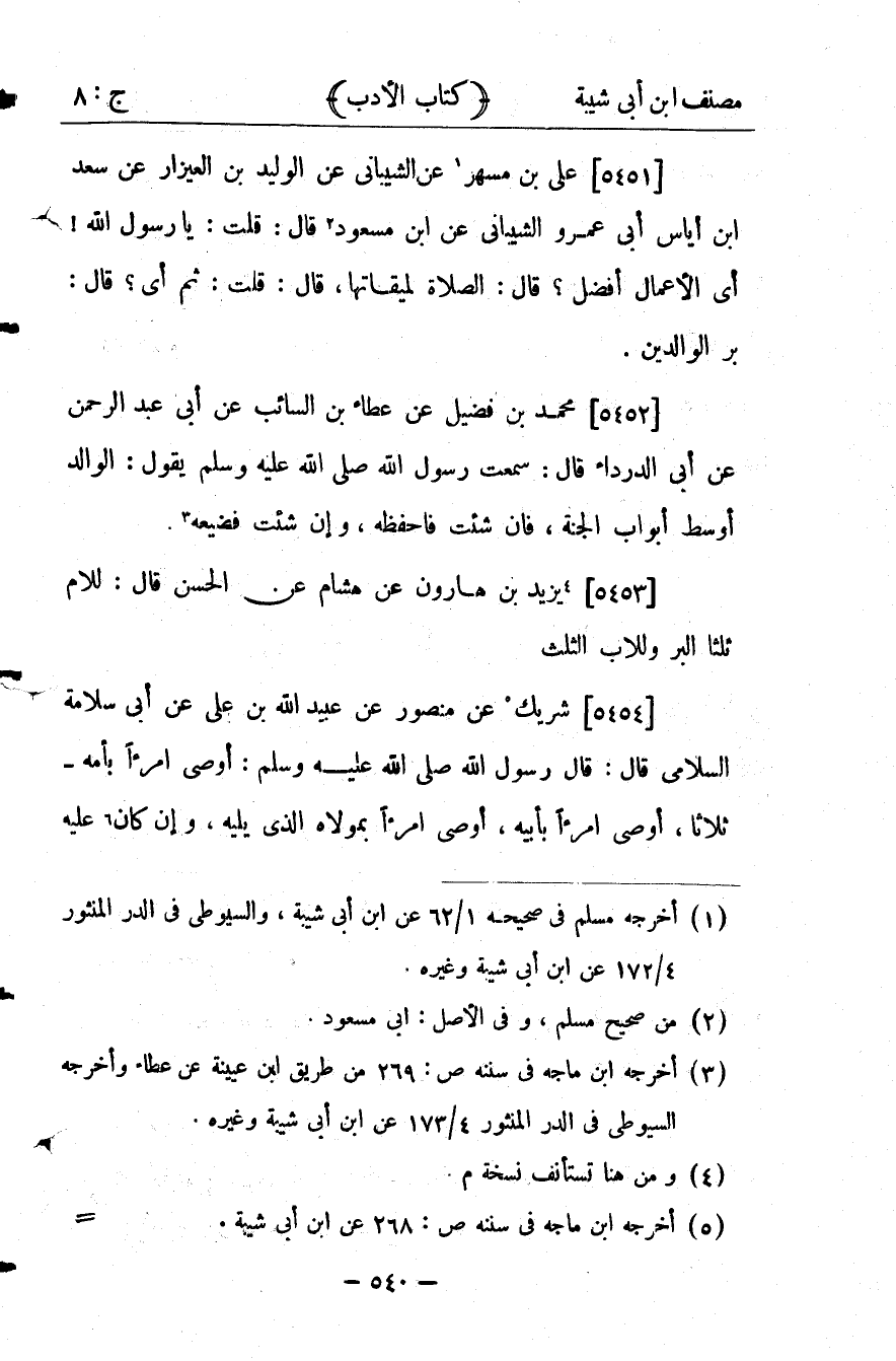 25908- حَدَّثَنَا عَلِيُّ بْنُ مُسْهِرٍ ، عَنِ الشَّيْبَانِيِّ ، عَنِ الْوَلِيدِ بْنِ الْعَيْزَارِ ، عَنْ سَعْدِ بْنِ إيَاسٍ أَبِي عَمْرٍو الشَّيْبَانِيِّ ، عَنِ ابْنِ مَسْعُودٍ ، قَالَ : قُلْتُ : يَا رَسُولَ اللهِ ، أَيُّ الأَعْمَالِ أَفْضَلُ ؟ قَالَ : الصَّلاَةُ لِمِيقَاتِهَا ، قَالَ : قُلْتُ : ثُمَّ أَيُّ ؟ قَالَ : بِرُّ الْوَالِدَيْنِ.