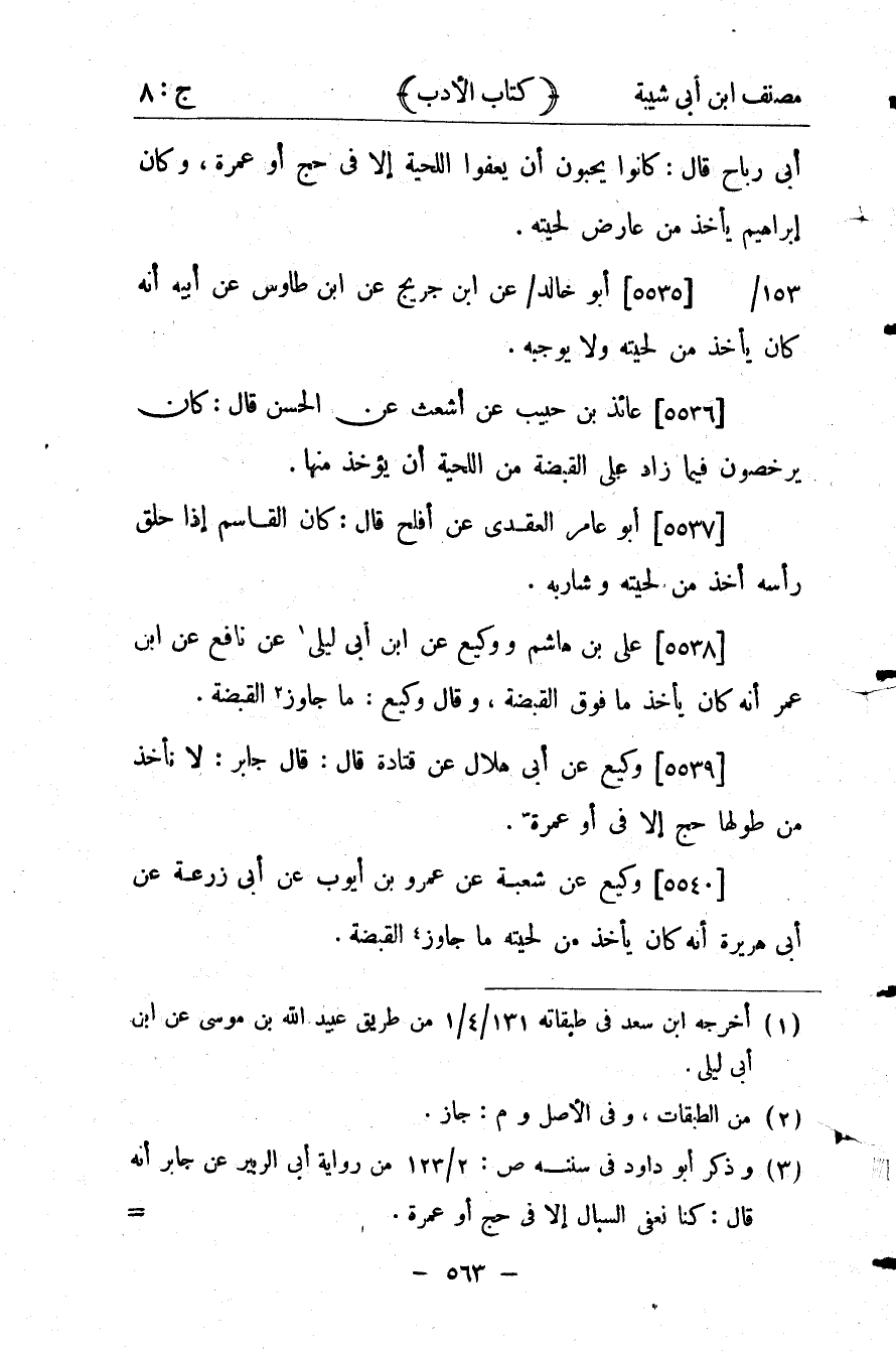 25997- حَدَّثَنَا عَلِيُّ بْنُ هَاشِمٍ ، وَوَكِيعٌ ، عَنِ ابْنِ أَبِي لَيْلَى ، عَنْ نَافِعٍ ، عَنِ ابْنِ عُمَرَ ، أَنَّهُ كَانَ يَأْخُذُ مَا فَوْقَ الْقُبْضَةِ ، وَقَالَ وَكِيعٌ : مَا جَازَ الْقُبْضَةَ.