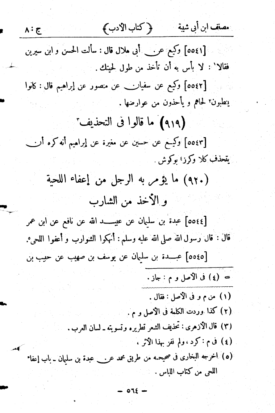26003- حَدَّثَنَا عَبْدَةُ بْنُ سُلَيْمَانَ ، عَنْ عُبَيْدِ اللهِ ، عَنْ نَافِعٍ ، عَنِ ابْنِ عُمَرَ ، قَالَ : قَالَ رَسُولُ اللهِ صلى الله عليه وسلم : انْهَكُوا الشَّوَارِبَ وَاعْفُوا اللِّحَى.