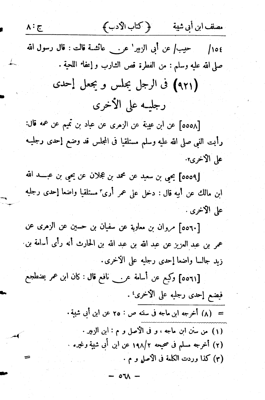 26020- حَدَّثَنَا مَرْوَانُ بْنُ مُعَاوِيَةَ ، عَنْ سُفْيَانَ بْنِ حُسَيْنٍ ، عَنِ الزُّهْرِيِّ ، عَنْ عُمَرَ بْنِ عَبْدِ الْعَزِيزِ ، عَنْ عَبْدِ اللهِ بْنِ عَبْدِ اللهِ بْنِ الْحَارِثِ ، أَنَّهُ رَأَى أُسَامَةَ بْنَ زَيْدٍ جَالِسًا وَاضِعًا إحْدَى رِجْلَيْهِ عَلَى الأُخْرَى.