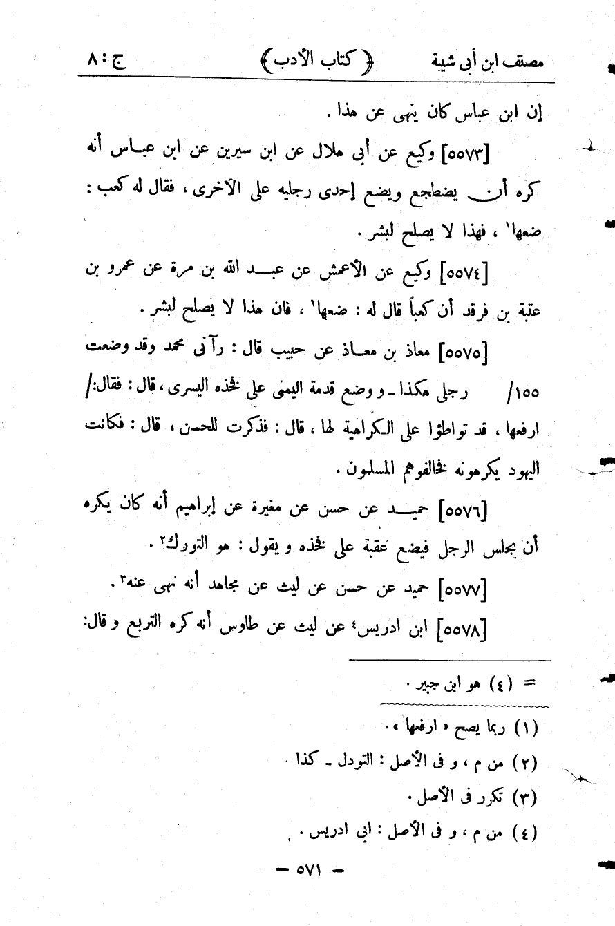 26034- حَدَّثَنَا وَكِيعٌ ، عَنْ إِسْمَاعِيل ، عَنْ وَاصِلٍ ، أَنَّ جَرِيرًا جَلَسَ وَوََضَعَ إحْدَى رِجْلَيْهِ عَلَى الأُخْرَى فَقَالَ لَهُ كَعْبٌ : ضَعْهَا ، فَإن هَذَا لاَ يَصْلُحُ لِبَشَرٍ.