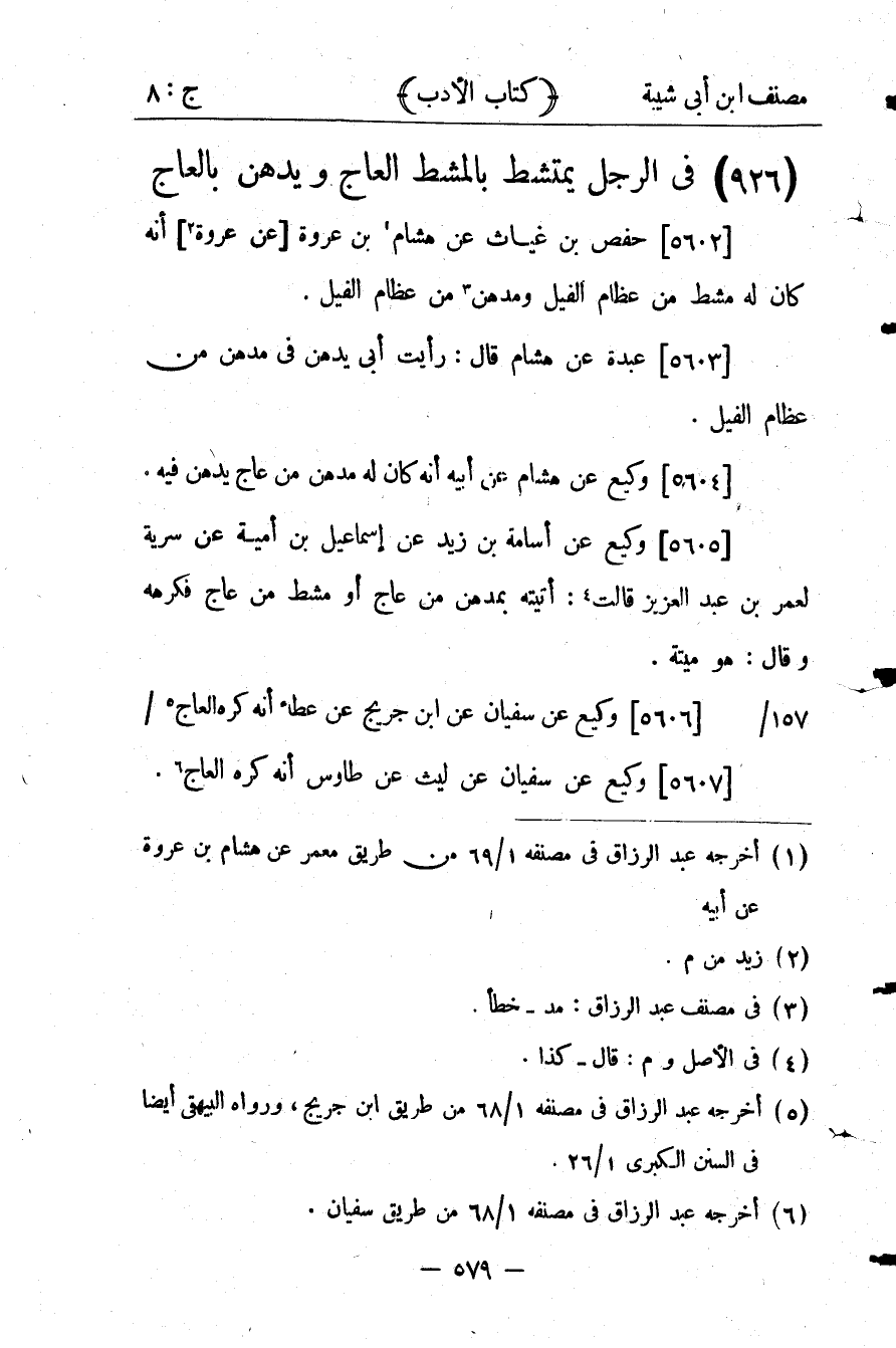 26064- حَدَّثَنَا عَبْدَةُ ، عَنْ هِشَامٍ ، قَالَ : رَأَيْتُ أَبِي يَدَّهِنُ فِي مُدْهُنٍ مِنْ عِظَامِ الْفِيلِ.