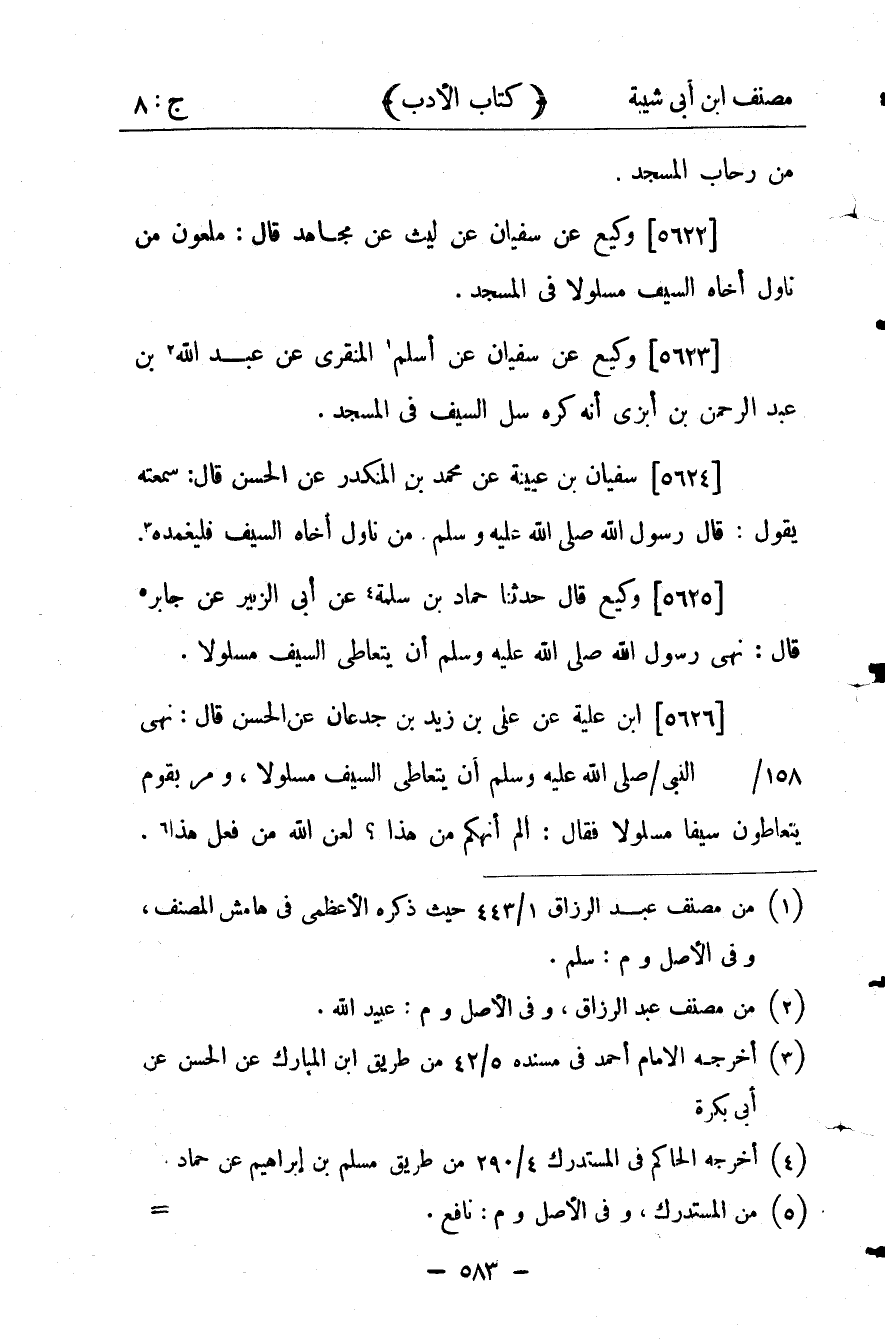 26083- حَدَّثَنَا وَكِيعٌ ، عَنْ سُفْيَانَ ، عَنْ لَيْثٍ ، عَنْ مُجَاهِدٍ ، قَالَ : مَلْعُونٌ مَنْ نَاوَلَ أَخَاهُ السَّيْفَ مَسْلُولاً فِي الْمَسْجِدِ.