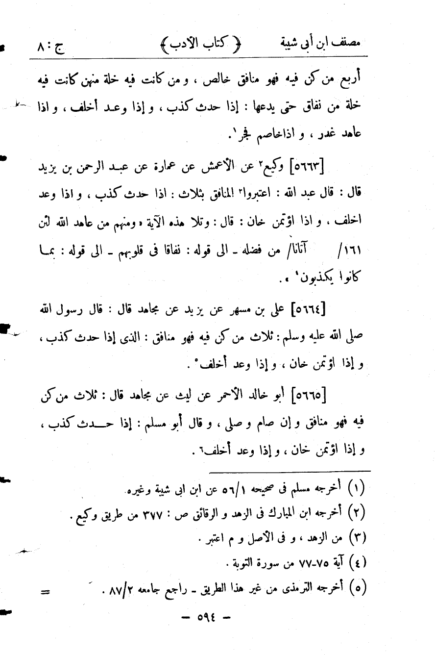 26125- حَدَّثَنَا غُنْدَرٌ ، عَنْ شُعْبَةَ ، عَنْ سِمَاكٍ ، عَن صُبَيح بْنِ عَبْدِ اللهِ ، عَنْ عَبْدِ اللهِ بْنِ عَمْرٍو ، قَالَ : ثَلاَثٌ مَنْ كُنَّ فِيهِ فَهُوَ مُنَافِقٌ : إذَا حَدَّثَ كَذَبَ وَإِذَا وَعَدَ أَخْلَفَ وَإِذَا أُؤْتُمِنَ خَانَ : قَالَ : وَتَلاَ هَذِهِ الآيَةَ : {وَمِنْهُمْ مَنْ عَاهَدَ اللَّهَ لَئِنْ آتَانَا مِنْ فَضْلِهِ} إلَى قَوْلِهِ : {نِفَاقًا فِي قُلُوبِهِمْ} إلَى قَوْلِهِ : {بِمَا كَانُوا يَكْذِبُونَ}.