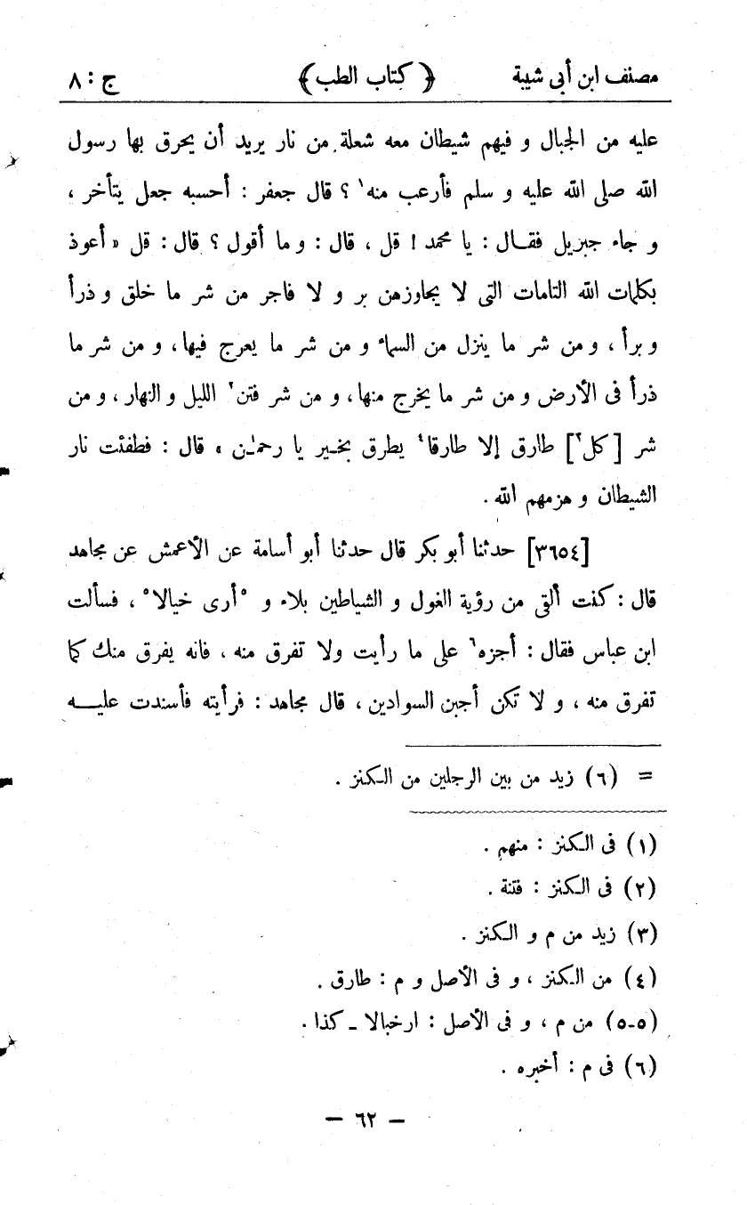 24069- حَدَّثَنَا أَبُو أُسَامَةَ ، قَالَ : حَدَّثَنَا الأَعْمَشِ ، عَنْ مُجَاهِدٍ ، قَالَ : كُنْتُ أَلْقَى مِنْ رُؤْيَةِ الْغُولِ وَالشَّيَاطِينِ بَلاَءً وَأَرَى خَيَالاً ، فَسَأَلْتُ ابْنَ عَبَّاسٍ ؟ فَقَالَ : أَخْبِرنِي عَلَى مَا رَأَيْتَ ، وَلاَ تُفْرَقنَّ مِنْهُ ، فَإِنَّهُ يَفْرَقُ مِنْكَ كَمَا تَفْرَقُ مِنْهُ ، وَلاَ تَكُنْ أَجْبَنَ السَّوَادَيْنِ ، قَالَ مُجَاهِدٌ : فَرَأَيْتُهُ فَأَسْنَدْتُ عَلَيْهِ بِعَصَا حَتَّى سَمِعْتُ وَقْعَتَهُ.