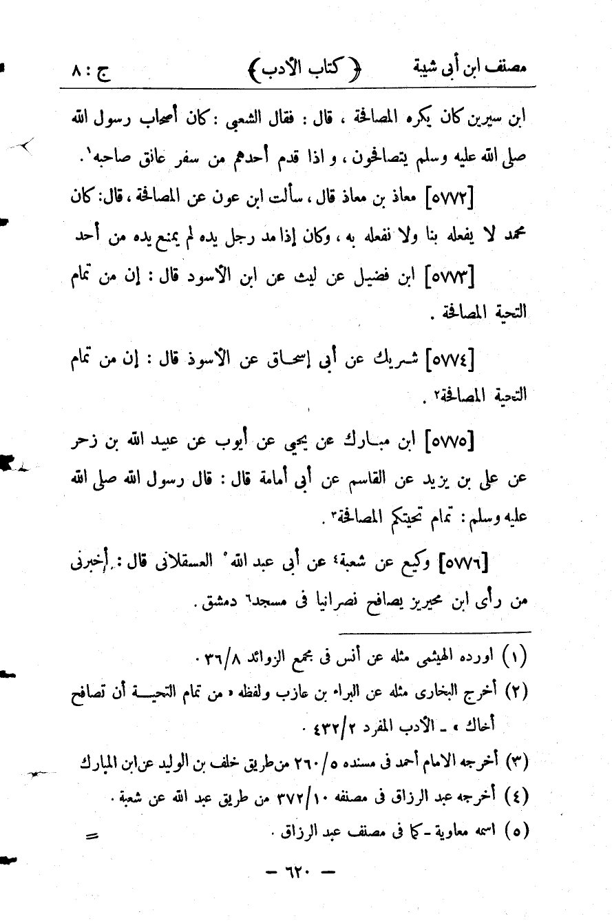 26239- حَدَّثَنَا وَكِيعٌ ، عَنْ شُعْبَةَ ، عَنْ أَبِي عَبْدِ اللهِ الْعَسْقَلاَنِيِّ ، قَالَ : أَخْبَرَنِي مَنْ رَأَى ابْنَ مُحَيْرِيزٍ يُصَافِحُ نَصْرَانِيًّا فِي مَسْجِدِ دِمَشْقَ.