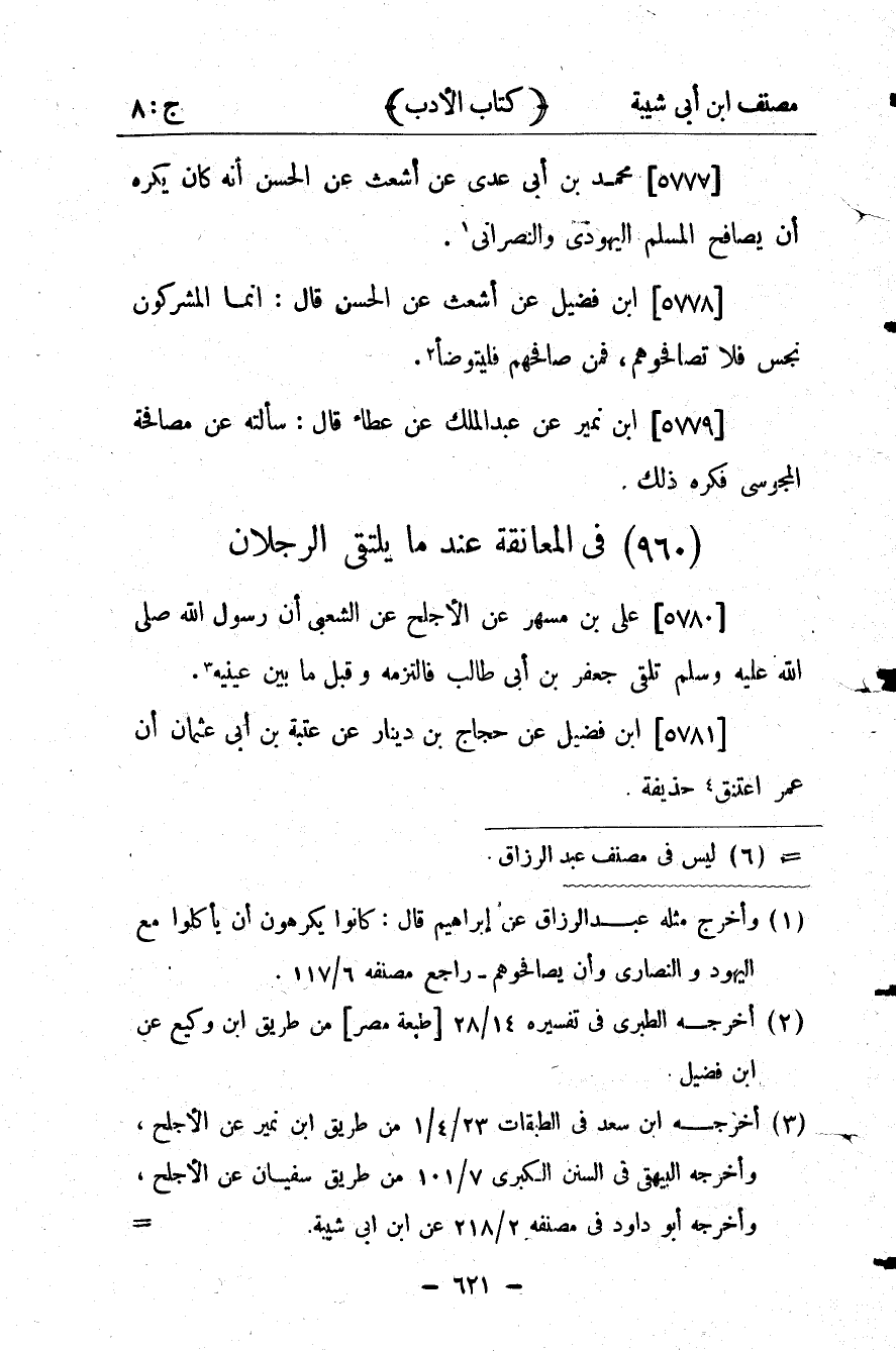 26242- حَدَّثَنَا ابْنُ نُمَيْرٍ ، عَنْ عَبْدِ الْمَلِكِ ، عَنْ عَطَاءٍ ، قَالَ : سَأَلْتُه عَنْ مُصَافَحَةِ الْمَجُوسِيِّ فَكَرِهَ ذَلِكَ.