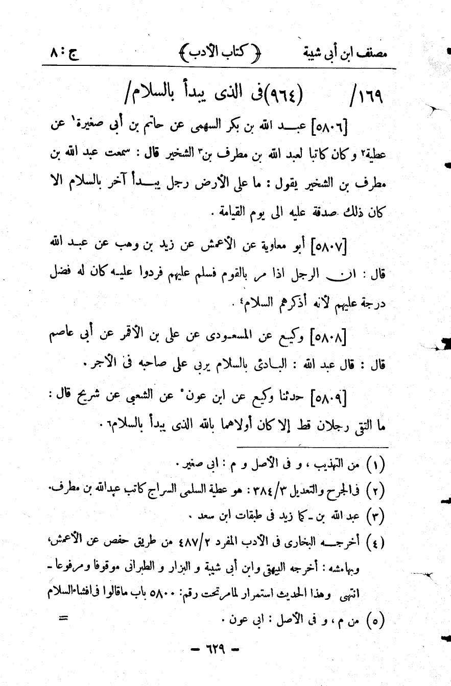 26269- حَدَّثَنَا عَبْدُ اللهِ بْنُ بَكْرٍ السَّهْمِيُّ ، عَنْ حَاتِمِ بْنِ أَبِي صَغِيرَةَ ، عَنْ عَطِيَّةَ وَكَانَ كَاتِبًا لِعَبْدِ اللهِ بْنِ مُطَرِّفِ بْنِ الشِّخِّيرِ ، قَالَ : سَمِعْتُ عَبْدَ اللهِ بْنَ مُطَرِّفِ بْنِ الشِّخِّيرِ يَقُولُ : مَا عَلَى وجه الأَرْضِ رَجُلٌ يَبْدَأُ آخَرَ بِالسَّلاَمِ إلاَّ كَانَ ذَلِكَ صَدَقَةً عَلَيْهِ إلَى يَوْمِ الْقِيَامَةِ.
