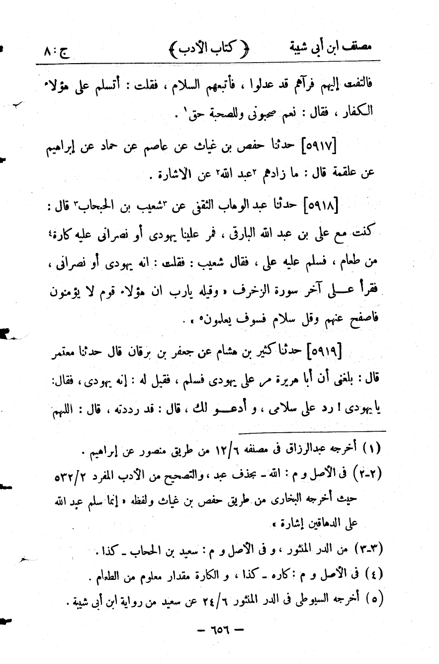 26387- حَدَّثَنَا عَبْدُ الْوَهَّابِ الثَّقَفِيُّ ، عَنْ شُعَيْبِ بْنِ الْحَبْحَابِ ، قَالَ : كُنْتُ مَعَ عَلِيِّ بْنِ عَبْدِ اللهِ الْبَارِقِيِّ ، فَمَرَّ عَلَيْنَا يَهُودِيٌّ ، أَوْ نَصْرَانِيٌّ عَلَيْهِ كَارَةٌ مِنْ طَعَامٍ ، فَسَلَّمَ عَلَيْهِ عَلِيٌّ ، فَقَالَ شُعَيْبٌ : فَقُلْت : إِنَّهُ يَهُودِيٌّ ، أَوْ نَصْرَانِيٌّ ، فَقَرَأَ عَلِيٌّ آخِرَ سُورَةِ الزُّخْرُفِ {وَقِيلِهِ يَا رَبِّ إنَّ هَؤُلاَءِ قَوْمٌ لاَ يُؤْمِنُونَ فَاصْفَحْ عَنْهُمْ وَقُلْ سَلاَمٌ فَسَوْفَ يَعْلَمُونَ}.