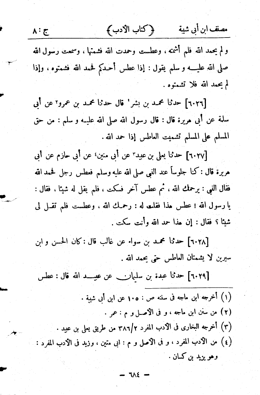 26498- حَدَّثَنَا يَعْلَى بْنُ عُبَيْدٍ ، عَنْ أَبِي مُنَيْنٍ ، عَنْ أَبِي حَازِمٍ ، عَنْ أَبِي هُرَيْرَةَ ، قَالَ : كُنَّا جُلُوسًا عِنْدَ النَّبِيِّ صلى الله عليه وسلم فَعَطَسَ رَجُلٌ فَحَمِدَ اللَّهَ فَقَالَ النَّبِيُّ صلى الله عليه وسلم : يَرْحَمُك اللَّهُ ، ثُمَّ عَطَسَ آخَرُ فَسَكَتَ ، فَلَمْ يَقُلْ لَهُ شَيْئًا ، فَقَالَ : يَا رَسُولَ اللهِ ، عَطَسَ هَذَا فَقُلْت لَهُ : رَحِمَك اللَّهُ ، وَعَطَسْت فَلَمْ تَقُلْ لِي شَيْئًا ؟ فَقَالَ : إنَّ هَذَا حَمِدَ اللَّهَ وَأَنْتَ سَكَتَّ.