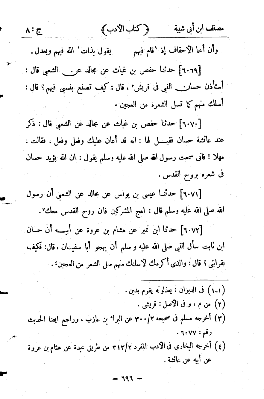26542- حَدَّثَنَا حَفْصُ بْنُ غِيَاثٍ ، عَن مُجَالِدٍ ، عَنِ الشَّعْبِيِّ ، قَالَ : ذُكِرَ عِنْدَ عَائِشَةَ حَسَّانُ فَقِيلَ لَهَا : إِنَّهُ قَدْ أَعَانَ عَلَيْك وَفَعَلَ وَفَعَلَ ، فَقَالَتْ : مَهْلاً ، فَإِنِّي سَمِعْت رَسُولَ اللهِ صلى الله عليه وسلم يَقُولُ : إنَّ اللَّهَ يُؤَيِّدُ حَسَّانَ فِي شِعْرِهِ بِرُوحِ الْقُدُسِ.