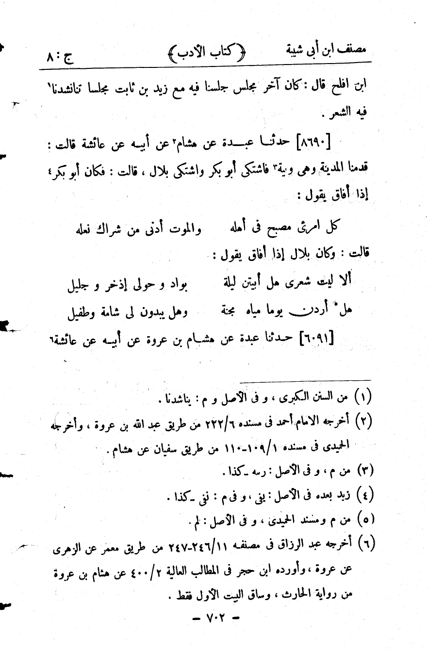26562- حَدَّثَنَا عَبْدَةُ ، عَن هِشَامٍ ، عَنْ أَبِيهِ ، عَنْ عَائِشَةَ ، قَالَتْ : قدِمْنَا الْمَدِينَةَ وَهِيَ وَبِيئةٌ فَاشْتَكَى أَبُو بَكْرٍ وَاشْتَكَى بِلاَلٌ ، قَالَتْ : فَكَانَ أَبُو بَكْرٍ تعني إذَا أَفَاقَ يَقُولُ :