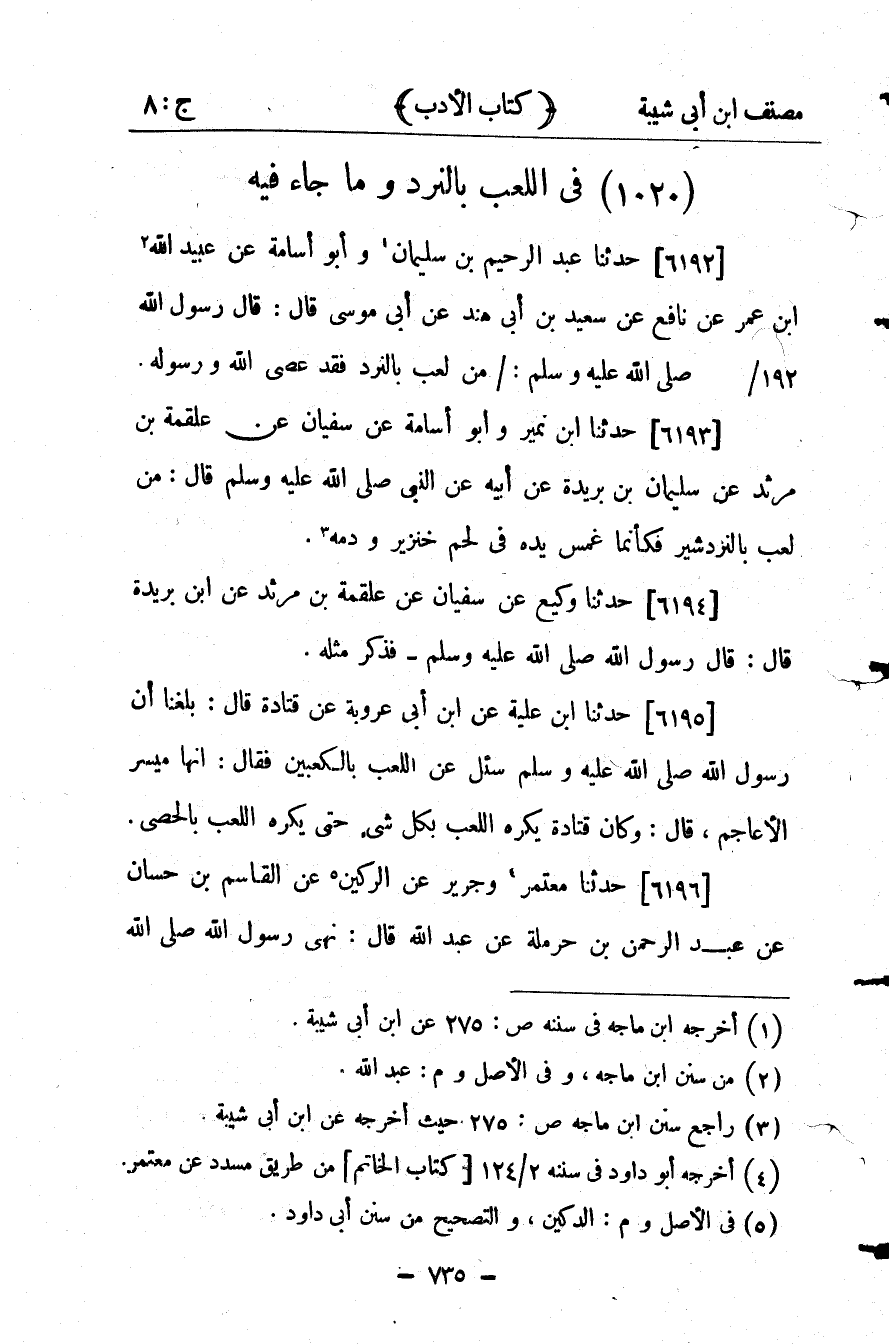 26666- حَدَّثَنَا ابْنُ نُمَيْرٍ ، وَأَبُو أُسَامَةَ ، عَن سُفْيَانَ ، عَنْ عَلْقَمَةَ بْنِ مَرْثَدٍ ، عَن سُلَيْمَانَ بْنِ بُرَيْدَةَ ، عَنْ أَبِيهِ ، عَنِ النَّبِيِّ صلى الله عليه وسلم ، قَالَ : مَنْ لَعِبَ بِالنَّرْدَشِيرِ فَكَأَنَّمَا غَمَسَ يَدَهُ فِي لَحْمِ خِنْزِيرٍ وَدَمِهِ.