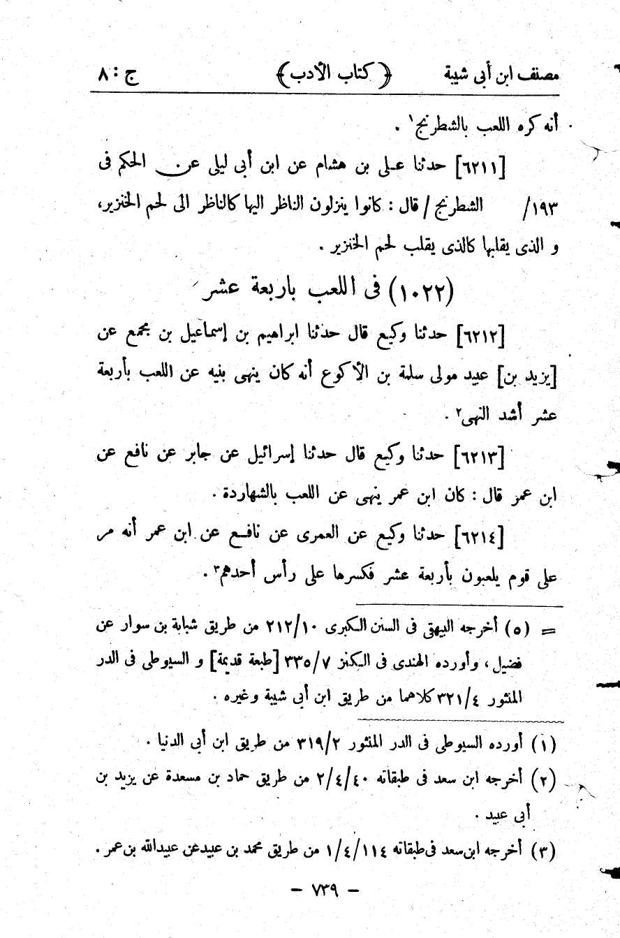 26684- حَدَّثَنَا عَلِيُّ بْنُ هَاشِم ، عَنِ ابْنِ أَبِي لَيْلَى ، عَنِ الْحَكَمِ فِي الشِّطْرَنْجِ ، قَالَ : كَانُوا يُنْزِلُونَ النَّاظِرَ إلَيْهَا كَالنَّاظِرِ إلَى لَحْمِ الْخِنْزِيرِ ، وَالَّذِي يُقْلِبُهَا كَاَلَّذِي يُقْلِبُ لَحْمَ الْخِنْزِيرِ.