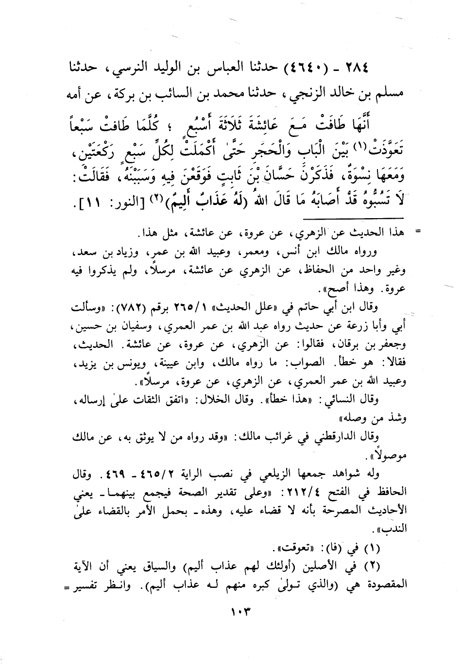 4640 - حَدَّثَنَا الْعَبَّاسُ بْنُ الْوَلِيدِ النَّرْسِيُّ، حَدَّثَنَا مُسْلِمُ بْنُ خَالِدٍ الزَّنْجِيُّ، حَدَّثَنَا مُحَمَّدُ بْنُ السَّائِبِ بْنِ بَرَكَةَ، عَنْ أُمِّهِ أَنَّهَا طَافَتْ مَعَ عَائِشَةَ ثَلَاثَةَ أَسْبُعٍ كُلَّمَا طَافَتْ سَبْعًا تَعَوَّذَتْ بَيْنَ الْبَابِ وَالْحِجْرِ حَتَّى أَكْمَلَتْ لِكُلِّ سَبْعٍ رَكْعَتَيْنِ وَمَعَهَا " §نِسْوَةٌ فَذَكَرْنَ حَسَّانَ بْنَ ثَابِتٍ فَوَقَعْنَ فِيهِ وَسَبَبْنَهُ. فَقَالَتْ: لَا تَسُبُّوهُ قَدْ أَصَابَهُ مَا قَالَ اللَّهُ {لَهُ عَذَابٌ عَظِيمٌ} [النور: 11] وَقَدْ عَمِيَ. وَاللَّهِ إِنِّي أَرْجُو أَنْ يُدْخِلَهُ اللَّهُ الْجَنَّةَ بِكَلِمَاتٍ قَالَهُنَّ لِمُحَمَّدٍ صَلَّى اللهُ عَلَيْهِ وَسَلَّمَ حِينَ يَقُولُ لِأَبِي سُفْيَانَ بْنِ الْحَارِثِ: