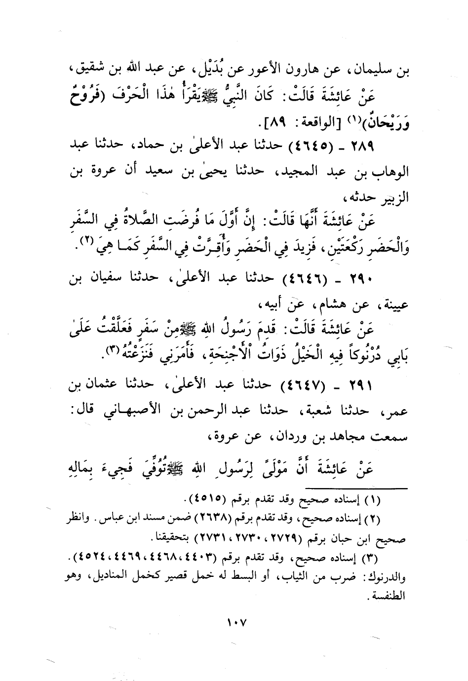 4645 - حَدَّثَنَا عَبْدُ الْأَعْلَى بْنُ حَمَّادٍ، حَدَّثَنَا عَبْدُ الْوَهَّابِ بْنُ عَبْدِ الْمَجِيدِ، حَدَّثَنَا يَحْيَى بْنُ سَعِيدٍ، أَنَّ عُرْوَةَ بْنَ الزُّبَيْرِ، حَدَّثَهُ عَنْ عَائِشَةَ أَنَّهَا قَالَتْ: إِنَّ «§أَوَّلَ مَا فُرِضَتِ الصَّلَاةُ فِي السَّفَرِ وَالْحَضَرِ رَكْعَتَيْنِ فَزِيدَ فِي الْحَضَرِ وَأُقِرَّتْ فِي السَّفَرِ كَمَا هِيَ» Kإسناده صحيح