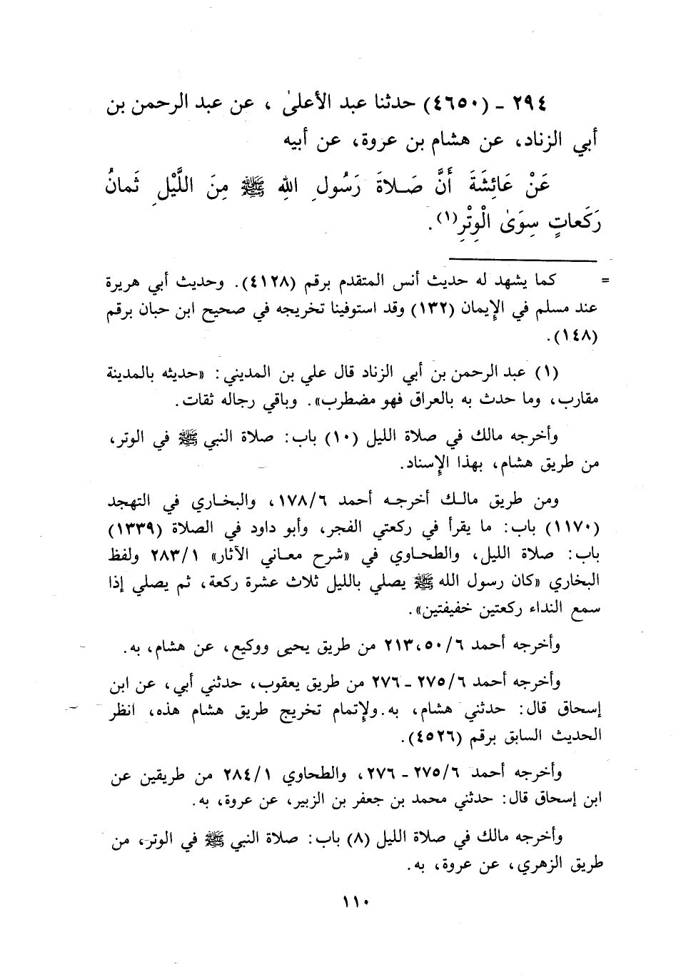 4650 - حَدَّثَنَا عَبْدُ الْأَعْلَى، عَنْ عَبْدِ الرَّحْمَنِ بْنِ أَبِي الزِّنَادِ، عَنْ هِشَامِ بْنِ عُرْوَةَ، عَنْ أَبِيهِ، عَنْ عَائِشَةَ، أَنَّ «§صَلَاةَ رَسُولِ اللَّهِ صَلَّى اللهُ عَلَيْهِ وَسَلَّمَ مِنَ اللَّيْلِ ثَمَانُ رَكَعَاتٍ سِوَى الْوِتْرِ»