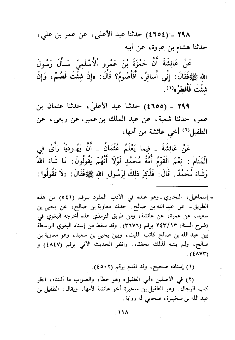 4654 - حَدَّثَنَا عَبْدُ الْأَعْلَى، عَنْ عُمَرَ بْنِ عَلِيٍّ، حَدَّثَنَا هِشَامُ بْنُ عُرْوَةَ، عَنْ أَبِيهِ، عَنْ عَائِشَةَ، أَنَّ حَمْزَةَ بْنَ عَمْرٍو الْأَسْلَمِيَّ سَأَلَ رَسُولَ اللَّهِ صَلَّى اللهُ عَلَيْهِ وَسَلَّمَ فَقَالَ: " §إِنِّي أُسَافِرُ، أَفَأَصُومُ؟ قَالَ: «إِنْ شِئْتَ فَصُمْ، وَإِنْ شِئْتَ فَأَفْطِرْ» Kإسناده صحيح