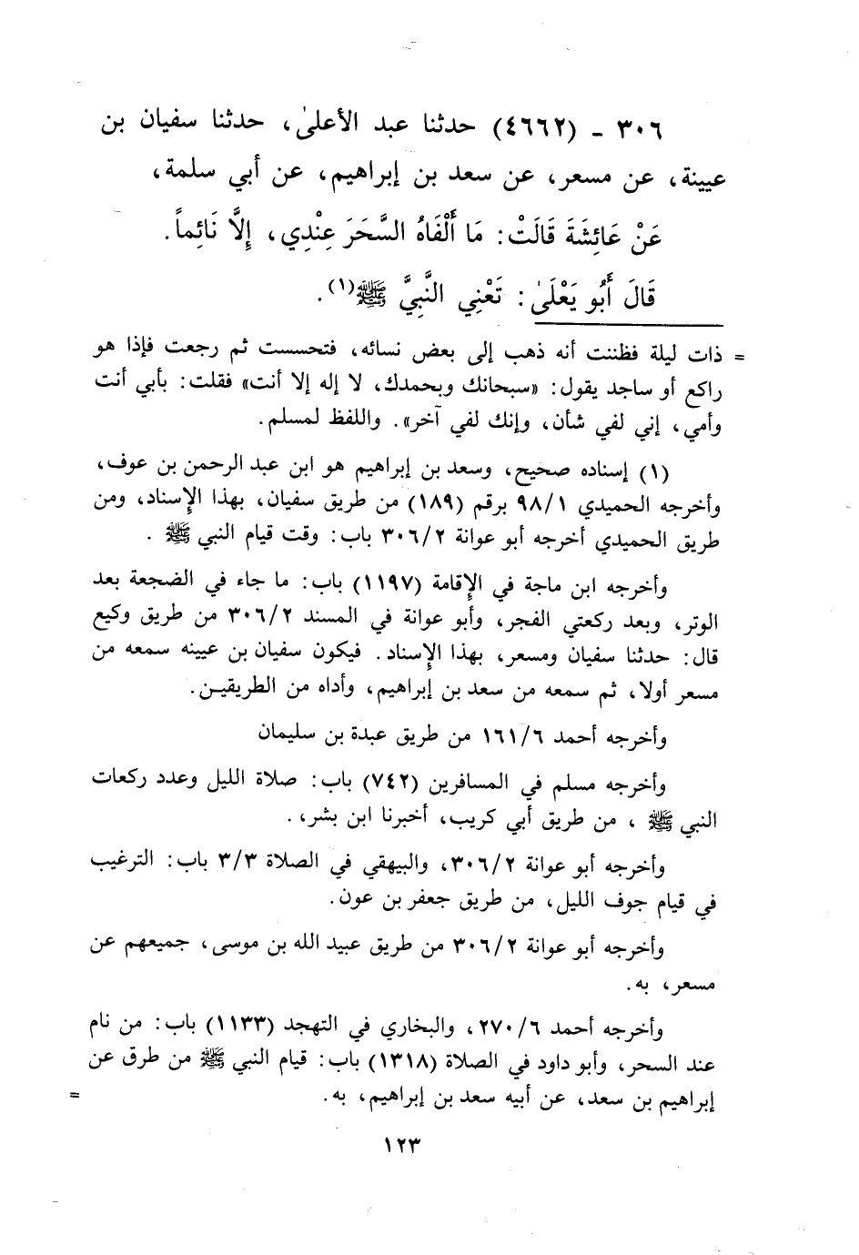 4662 - حَدَّثَنَا عَبْدُ الْأَعْلَى، حَدَّثَنَا سُفْيَانُ بْنُ عُيَيْنَةَ، عَنْ مِسْعَرٍ، عَنْ سَعْدِ بْنِ إِبْرَاهِيمَ، عَنْ أَبِي سَلَمَةَ، عَنْ عَائِشَةَ قَالَتْ: «§مَا أَلْفَاهُ السَّحَرُ عِنْدِي إِلَّا نَائِمًا». قَالَ أَبُو يَعْلَى: تَعْنِي النَّبِيَّ صَلَّى اللهُ عَلَيْهِ وَسَلَّمَKإسناده صحيح